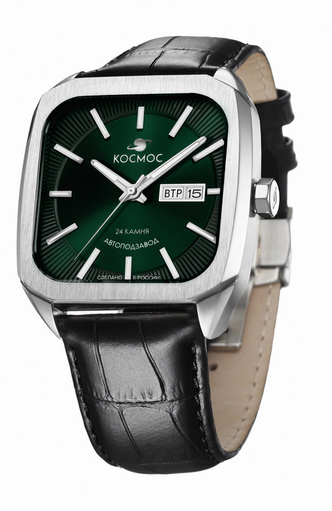 Мужские наручные часы Космос Марсоход K 213.11.37 — это уникальная лимитированная серия, созданная в честь одного из самых амбициозных проектов в истории космических исследований. Модель объединяет дух советского инженерного наследия с современными технологиями, создавая аксессуар, сочетающий прочность, функциональность и ретро-стиль. Часы оснащены механическим механизмом с автоподзаводом от Seiko TMI, известным своей надёжностью и точностью. Корпус выполнен из нержавеющей стали 316L в форме квадрата с закруглёнными углами и дополнен сочетанием зеркальной полировки и сатинированной отделки, что придаёт модели солидность и оригинальность. Циферблат зелёного цвета имеет двухуровневую структуру. Центральный уровень содержит три стрелки, часовая и минутная из которых оснащены люминесцентным покрытиемЛюминесцентное покрытиеПозволяет считывать показания времени в темноте. Производители наносят на стрелки, часовые индексы, безель или поверхность циферблата светонакопительный состав, дающий холодное свечение. для отличной читаемости даже в условиях слабого освещения. Индикация дня недели и даты представлена сразу на двух языках — русском и английском, что делает модель удобной для международного использования. Защиту циферблата обеспечивает сапфировое стеклоСапфировое стеклоПрочный и надёжный материал из кристалла сапфира синтетического происхождения, характеризующийся особой твёрдостью и устойчивостью к царапинам и повреждениям. с антибликовым покрытиемАнтибликовое покрытиеСлой оксида металла в 0,13-0,3 микрон, благодаря которому стекло часов не бликует и не отражает свет. Антибликовое покрытие уменьшает отражение света в 10 раз, обеспечивая отличную читаемость показателей циферблата., устойчивое к царапинам и повреждениям, гарантирующее чёткость восприятия информации при любом освещении. Заводная головка выполнена в форме гайки, что придаёт модели индустриальный шарм и подчёркивает её техническую направленность. Задняя крышка — прозрачная и закреплена на четырёх винтах, а также содержит индивидуальный номер модели, что подчёркивает её эксклюзивность. Первый выпуск ограничен 50 экземплярами с номерами от 01/50 до 50/50, второй выпуск — 150 штуками с номерами от 051/200 до 200/200. Ремешок изготовлен из натуральной кожи чёрного цвета и оснащён застёжкой с фирменным логотипом. Ширина ремешка составляет 26 мм, что обеспечивает плотное и комфортное прилегание на запястье. Часы обладают водонепроницаемостью , что позволяет использовать их при плавании и других водных активностях. Эти часы станут универсальным аксессуаром для тех, кто ценит сочетание истории, технологичности и стиля — идеальный выбор для уверенных в себе мужчин, следящих за своим имиджем и предпочитающих выделяться.