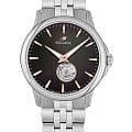 Мужские наручные часы Космос Телескоп K 304.10.34 — это уникальная лимитированная серия под названием Телескоп, посвящена аппарату приоткрывающего взгляду бескрайние дали космического пространства. Апертура открытого баланса модели по форме напоминает круглую линзу телескопа. Сквозь это окошко, расположенное на черном циферблате, также можно увидеть много интересного: ту самую систему «баланс-спираль» автоматического механизма, которая отвечает за точность хода. Корпус часов выполнен из нержавеющей стали, классической круглой формы и достаточно тонкий для механических моделей. Это стало возможным благодаря использованию механизма Miyota, калибр 9029, с высотой всего 3.9 мм. Циферблат декорирован вертикальной текстурой в ретро-стиле, по которой движутся крупные часовая и минутная стрелки, имеющие люминесцентное покрытиеЛюминесцентное покрытиеПозволяет считывать показания времени в темноте. Производители наносят на стрелки, часовые индексы, безель или поверхность циферблата светонакопительный состав, дающий холодное свечение., позволяющее определять время даже в темноте. Циферблат защищен прочным сапфировым стеклом с антибликовым покрытиемСапфировое стеклоПрочный и надёжный материал из кристалла сапфира синтетического происхождения, характеризующийся особой твёрдостью и устойчивостью к царапинам и повреждениям., обеспечивающим отличную читаемость показаний в любых условиях. Прозрачная задняя крышка, закрепленная на четырех винтах, демонстрирует механизм и содержит выгравированный индивидуальный номер экземпляра хх/50, отражающий лимитированный тираж всего в 50 штук. Браслет изготовлен из нержавеющей стали и оснащен удобной застёжкой «бабочка» с кнопкамиЗастёжка "бабочка"Такой вид застёжки дополняется предохранителями, помогающими избежать случайного раскрытия браслета. Обладают изящным исполнением. , которая сводит к минимуму вероятность потери. Модель Телескоп сочетает классический дизайн и универсальность, прекрасно подходя как к деловому костюму, так и к более повседневным образам.