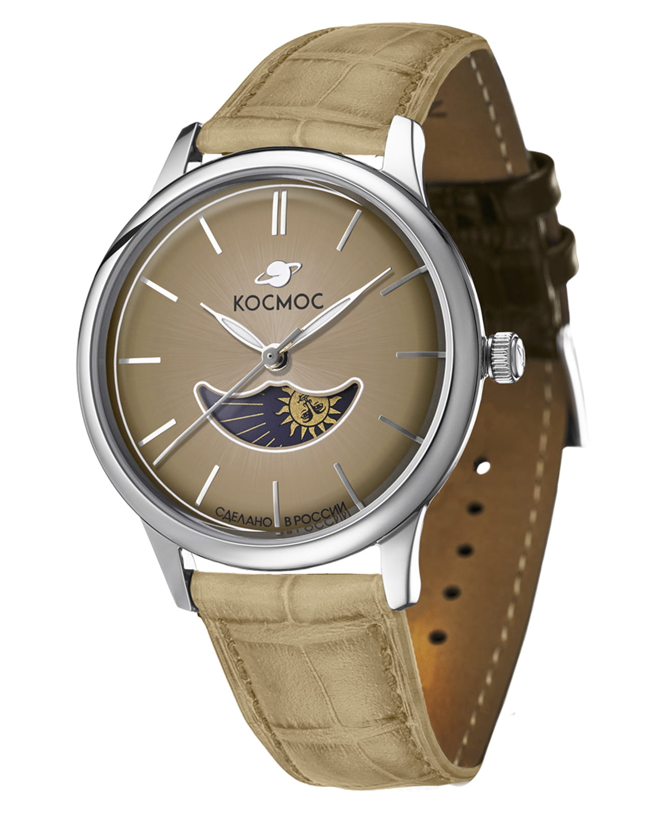 Женские наручные часы Космос Солнце и Луна K 617.12.32 — это сочетание традиций часового искусства 60-70-х годов и футуристического дизайна, вдохновленного космическими исследованиями. Они не только служат напоминанием о прошлом, но и побуждают задуматься о будущем, позволяя наслаждаться качеством и смыслом, вложенными в каждую деталь. Полированный корпус часов выполнен в виде силуэта летающей тарелки благодаря выпуклым формам стекла и нижней части корпуса. Стальные ушки, которые напоминают опоры летающей тарелки, завершает общий образ. На задней крышке часов выгравирован фантазийный сюжет – космическая станция будущего. Элегантные женские часы из серии Солнце и Луна выделяются функцией день/ночь. Бежевый циферблат выполнен в ретро-стиле с выгнутыми краями, что требует применения сложных технологий в производстве. Циферблаты такой формы были характерны для часов прошлых эпох. Кончик секундной стрелки изогнут в соответствии с формой циферблата. На градиентном выпуклом циферблате выполнена шлифовка в стиле солнечных лучей, а также размещены индексы, изготовленные вручную и закрепленные на двух штифтах. Часовая и минутная стрелки, а также круг по краю циферблата, напоминающий ореол Земли, с люминесцентным покрытиемЛюминесцентное покрытиеПозволяет считывать показания времени в темноте. Производители наносят на стрелки, часовые индексы, безель или поверхность циферблата светонакопительный состав, дающий холодное свечение., которое светится в темноте, создавая завораживающий эффект. Форма минерального стеклаМинеральное стеклоМинеральное стекло представляет собой искусственно выращенный минерал кварца. Такое стекло отличается особой устойчивостью к повреждениям и царапинам. Уступает по некоторым качествам сапфировому стеклу. тщательно продумана: оно выгнуто как снаружи, так и изнутри. Такое решение позволяет избежать искажения изображения на циферблате, в отличие от стекла с прямой внутренней частью, которое создает эффект линзы. Ремешок модели сделан из натуральной кожи бежевого цвета. Заводная головка, застежка и ремешок украшены фирменным логотипом.