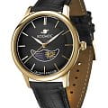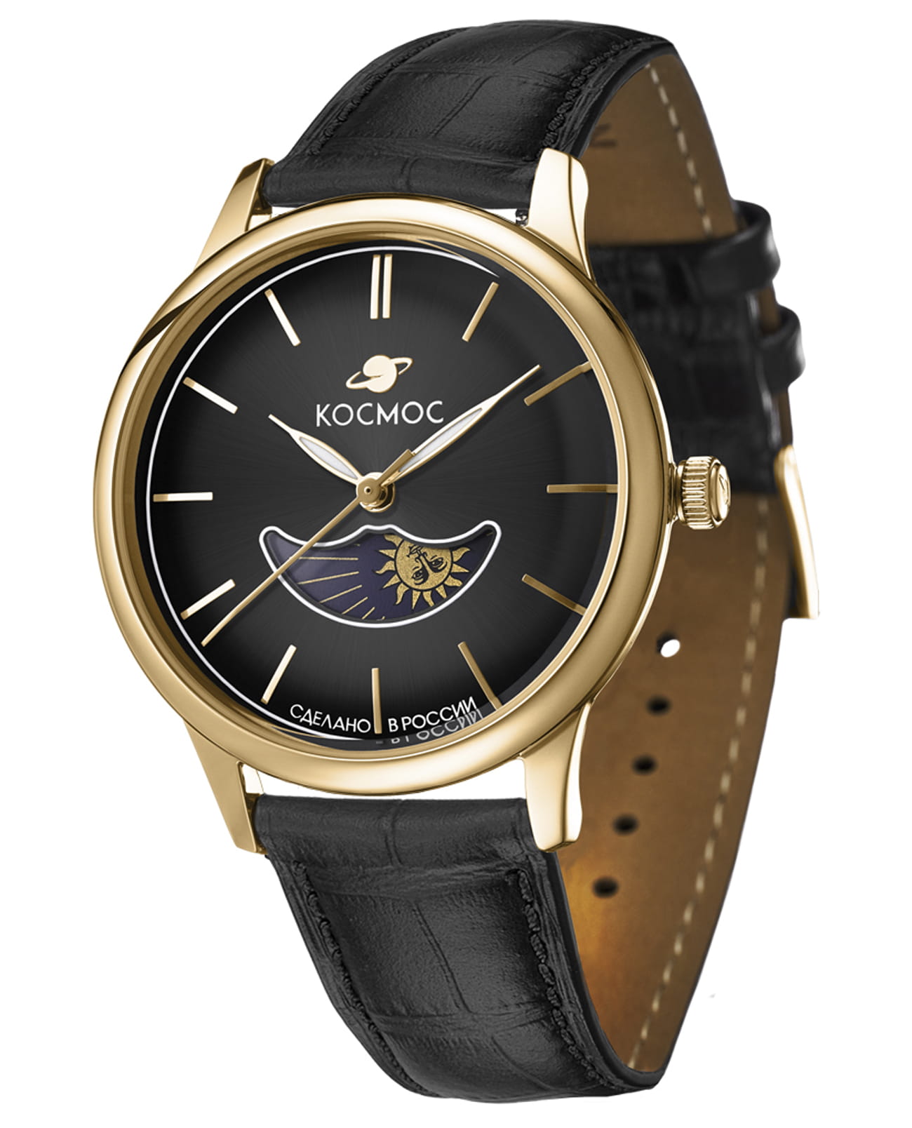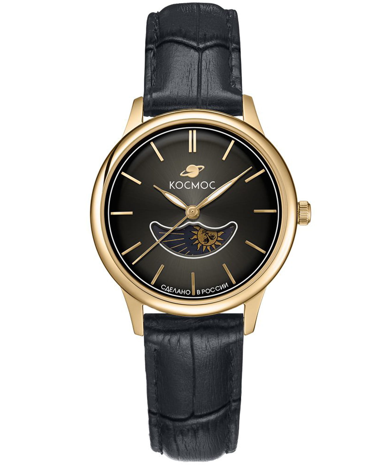 Женские наручные часы Космос Солнце и Луна K 617.21.31 — это сочетание традиций часового искусства 60-70-х годов и футуристического дизайна, вдохновленного космическими исследованиями. Они не только служат напоминанием о прошлом, но и побуждают задуматься о будущем, позволяя наслаждаться качеством и смыслом, вложенными в каждую деталь. Полированный корпус часов выполнен в виде силуэта летающей тарелки благодаря выпуклым формам стекла и нижней части корпуса. Стальные ушки, которые напоминают опоры летающей тарелки, завершает общий образ. На задней крышке часов выгравирован фантазийный сюжет – космическая станция будущего. Элегантные женские часы из серии Солнце и Луна выделяются функцией день/ночь. Черный циферблат выполнен в ретро-стиле с выгнутыми краями, что требует применения сложных технологий в производстве. Циферблаты такой формы были характерны для часов прошлых эпох. Кончик секундной стрелки изогнут в соответствии с формой циферблата. На градиентном выпуклом циферблате выполнена шлифовка в стиле солнечных лучей, а также размещены индексы, изготовленные вручную и закрепленные на двух штифтах. Часовая и минутная стрелки, а также круг по краю циферблата, напоминающий ореол Земли, с люминесцентным покрытиемЛюминесцентное покрытиеПозволяет считывать показания времени в темноте. Производители наносят на стрелки, часовые индексы, безель или поверхность циферблата светонакопительный состав, дающий холодное свечение., которое светится в темноте, создавая завораживающий эффект. Форма минерального стеклаМинеральное стеклоМинеральное стекло представляет собой искусственно выращенный минерал кварца. Такое стекло отличается особой устойчивостью к повреждениям и царапинам. Уступает по некоторым качествам сапфировому стеклу. тщательно продумана: оно выгнуто как снаружи, так и изнутри. Такое решение позволяет избежать искажения изображения на циферблате, в отличие от стекла с прямой внутренней частью, которое создает эффект линзы. Корпус изготовлен из гипоаллергенной стали с IP-покрытиемIP-покрытиеМетод ионного напыления. Демонстрирует повышенную устойчивость к истиранию, окислению и химическим веществам. Под воздействием высокого давления и температуры около 1500°C молекулы металла надёжно соединяются с частицами корпуса часов., что обеспечивает комфорт при ношении. Ремешок модели сделан из натуральной кожи черного цвета. Заводная головка, застежка и ремешок украшены фирменным логотипом.