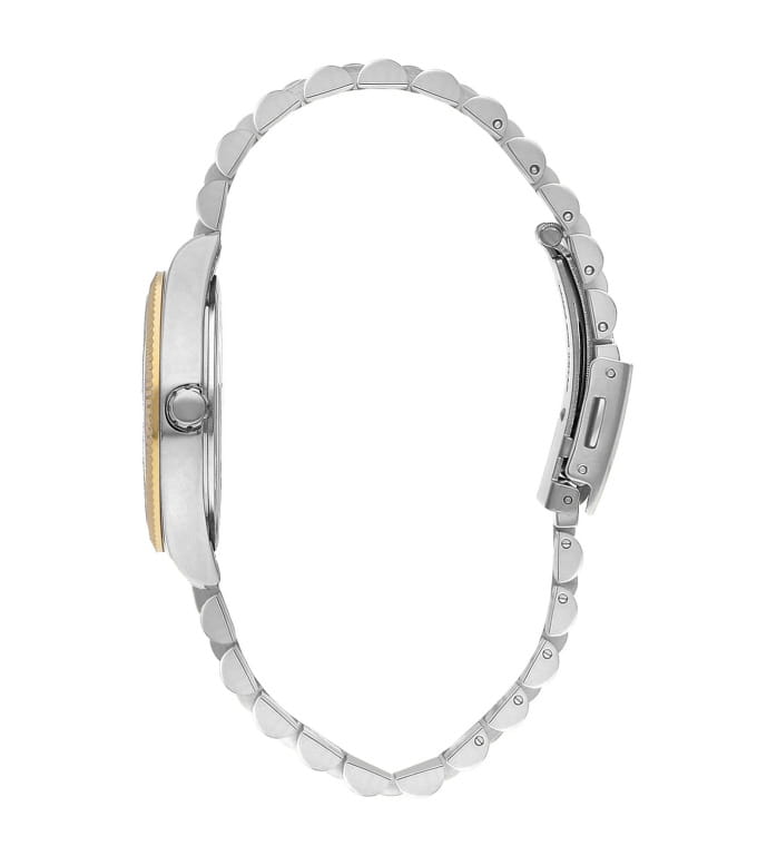 Женские часы Lee Cooper LC07811.230 — это стильное сочетание элегантности и современного дизайна. Корпус диаметром 37 мм выполнен из суперметалла серебристого цвета, придающий модели особый блеск. Неподвижный безельБезельВнешний ободок, закрепляющий стекло. В спортивных часах так называется поворотное кольцо с делениями на циферблате, выполняет роль таймера – замеряет отрезки времени на шкале. Неподвижный безель – элемент декора. Однонаправленно вращающийся безель на дайверских часах позволяет фиксировать моменты погружения и выныривания на поверхность. с IP-покрытиемIP-покрытиеМетод ионного напыления. Демонстрирует повышенную устойчивость к истиранию, окислению и химическим веществам. Под воздействием высокого давления и температуры около 1500°C молекулы металла надёжно соединяются с частицами корпуса часов. цвета золота. Изысканный циферблат защищен минеральным стекломМинеральное стеклоМинеральное стекло представляет собой искусственно выращенный минерал кварца. Такое стекло отличается особой устойчивостью к повреждениям и царапинам. Уступает по некоторым качествам сапфировому стеклу., обеспечивающим устойчивость к царапинам. Метки в виде римских цифр. Вынесенный циферблат с 24-х часовым указателем времени, индикацией даты и дня недели. Часы оснащены надежным кварцевым механизмом, а стальной браслет с частичным IP-покрытиемIP-покрытиеМетод ионного напыления. Демонстрирует повышенную устойчивость к истиранию, окислению и химическим веществам. Под воздействием высокого давления и температуры около 1500°C молекулы металла надёжно соединяются с частицами корпуса часов. на раскладной застёжкеРаскладная застёжкаТакой тип застёжки используется только на браслетах из металла. Она никогда не раскрывается полностью, происходит разделение на 2 и более частей. Раскладывающая застёжка снизит вероятность потери часов к минимуму. гарантирует комфортную посадку на запястье. Водозащита 50 метров защищает модель от случайных брызг и дождя. Lee Cooper  — отличный выбор для тех, кто ценит утонченность и качество.