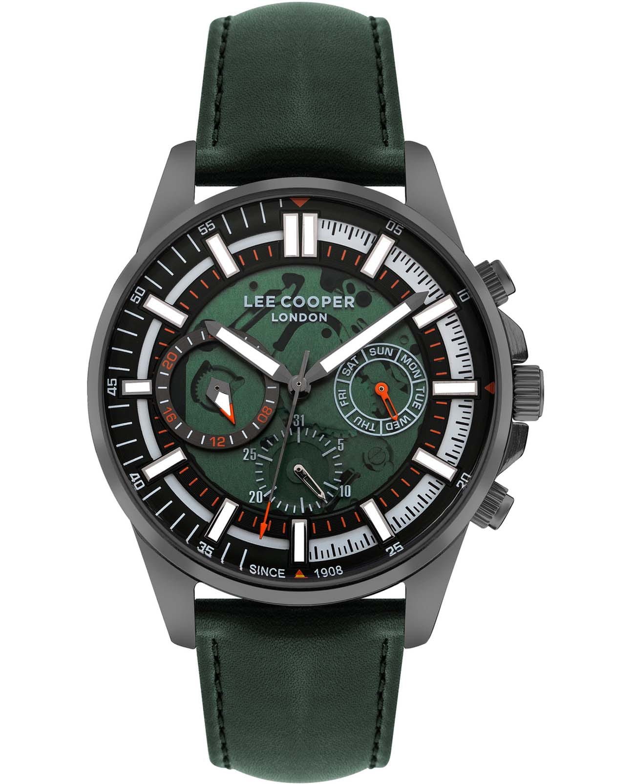 Lee Cooper LC07816.077 — элегантная модель с функциональными возможностями для повседневного использования. Корпус из суперметалла с IP-покрытиемIP-покрытиеМетод ионного напыления. Демонстрирует повышенную устойчивость к истиранию, окислению и химическим веществам. Под воздействием высокого давления и температуры около 1500°C молекулы металла надёжно соединяются с частицами корпуса часов. и диаметром 44 мм придаёт часам классический и современный вид. Циферблат защищён минеральным стекломМинеральное стеклоМинеральное стекло представляет собой искусственно выращенный минерал кварца. Такое стекло отличается особой устойчивостью к повреждениям и царапинам. Уступает по некоторым качествам сапфировому стеклу., устойчивым к царапинам, хорошо может выдержать небольшие удары и падения. Стильный циферблат оформлен изысканными индексами и дополнен окошками даты, дня недели и 24-часового индикатора, а также аккуратными метками и стрелками с люминесцентным покрытиемЛюминесцентное покрытиеПозволяет считывать показания времени в темноте. Производители наносят на стрелки, часовые индексы, безель или поверхность циферблата светонакопительный состав, дающий холодное свечение., что гарантирует читаемость даже в условиях недостаточного освещения. Часы работают на кварцевом механизме, обеспечивающем точность хода. Кожаный ремешок на стандартной застёжке гарантирует удобную посадку и надёжную фиксацию на запястье. Водозащита 50 метров защищает часы от брызг и дождя, делая их подходящими для повседневного использования.