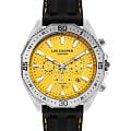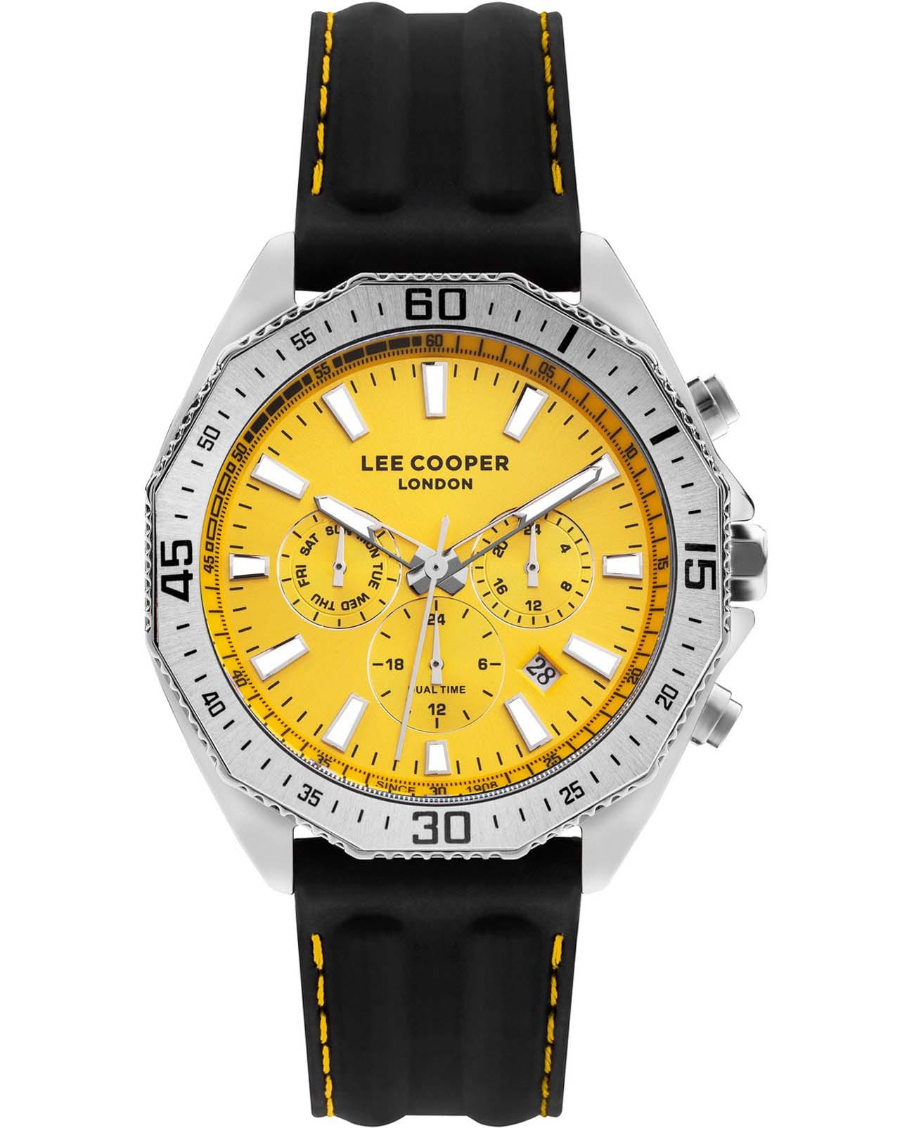 Мужские часы Lee Cooper LC07848.311 выполнены в классическом стиле и сочетают строгий дизайн с надёжным механизмом. Модель оснащена кварцевым механизмом, обеспечивающим точность хода и минимальное обслуживание. Корпус имеет размер 45 мм, изготовлен из суперметалла с поворотным безелемБезельВнешний ободок, закрепляющий стекло. В спортивных часах так называется поворотное кольцо с делениями на циферблате, выполняет роль таймера – замеряет отрезки времени на шкале. Неподвижный безель – элемент декора. Однонаправленно вращающийся безель на дайверских часах позволяет фиксировать моменты погружения и выныривания на поверхность.. Циферблат желтого цвета дополнен индексами для чёткого отсчёта времени, а также функциями отображения даты, дня недели, 24-часового индикатора и второго часового поясаВторой часовой поясФункция, позволяющая отображать время двух часовых поясов одновременно.. Защиту циферблата обеспечивает минеральное стеклоМинеральное стеклоМинеральное стекло представляет собой искусственно выращенный минерал кварца. Такое стекло отличается особой устойчивостью к повреждениям и царапинам. Уступает по некоторым качествам сапфировому стеклу., устойчивое к мелким механическим повреждениям. Циферблат украшен стрелками и метками с люминесцентным покрытиемЛюминесцентное покрытиеПозволяет считывать показания времени в темноте. Производители наносят на стрелки, часовые индексы, безель или поверхность циферблата светонакопительный состав, дающий холодное свечение., гармонично дополняющим общий дизайн модели. Ремень из каучука оснащен стандартной застежкой, обеспечивающим комфортное и безопасное ношение. Водозащита 5 АТМ позволяет использовать часы в повседневных условиях без риска повреждения от случайных брызг воды. Это сочетание классического дизайна, прочности материалов и качества исполнения для уверенных в себе мужчин.