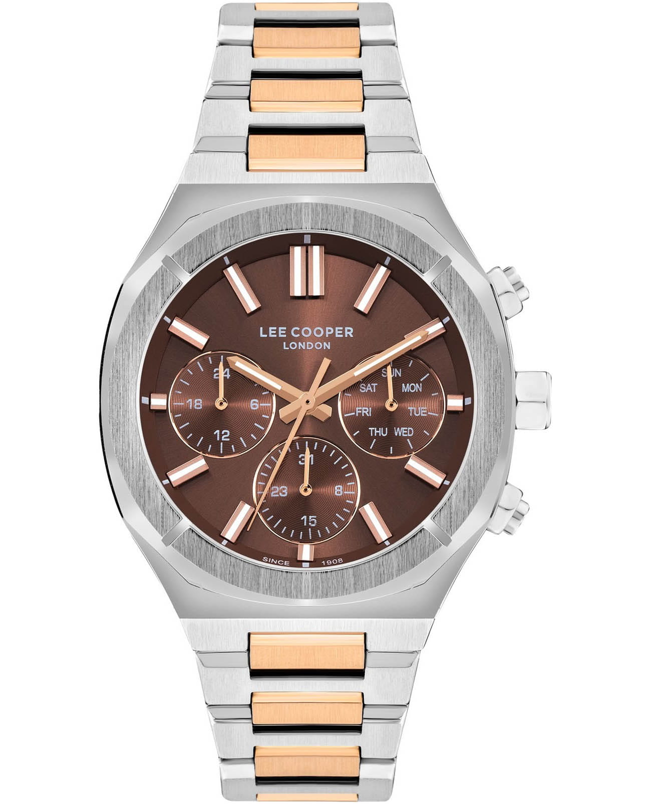Мужские часы Lee Cooper LC07959.540 с корпусом 43 мм, выполненным из суперметалла, сочетают современный стиль и надежность. Коричневый циферблат дополняет элегантный дизайн, а минеральное стеклоМинеральное стеклоМинеральное стекло представляет собой искусственно выращенный минерал кварца. Такое стекло отличается особой устойчивостью к повреждениям и царапинам. Уступает по некоторым качествам сапфировому стеклу. защищает его от царапин и повреждений. Точный кварцевый механизм обеспечивает стабильную работу. Функциональность модели расширена за счёт индикации даты, дня недели и 24-часового формата времени. Водозащита 50 м защищает от случайных брызг. Стальной браслет с IP-покрытиемIP-покрытиеМетод ионного напыления. Демонстрирует повышенную устойчивость к истиранию, окислению и химическим веществам. Под воздействием высокого давления и температуры около 1500°C молекулы металла надёжно соединяются с частицами корпуса часов. и раскладной застёжкойРаскладная застёжкаТакой тип застёжки используется только на браслетах из металла. Она никогда не раскрывается полностью, происходит разделение на 2 и более частей. Раскладывающая застёжка снизит вероятность потери часов к минимуму. гарантирует удобную посадку и надёжную фиксацию.