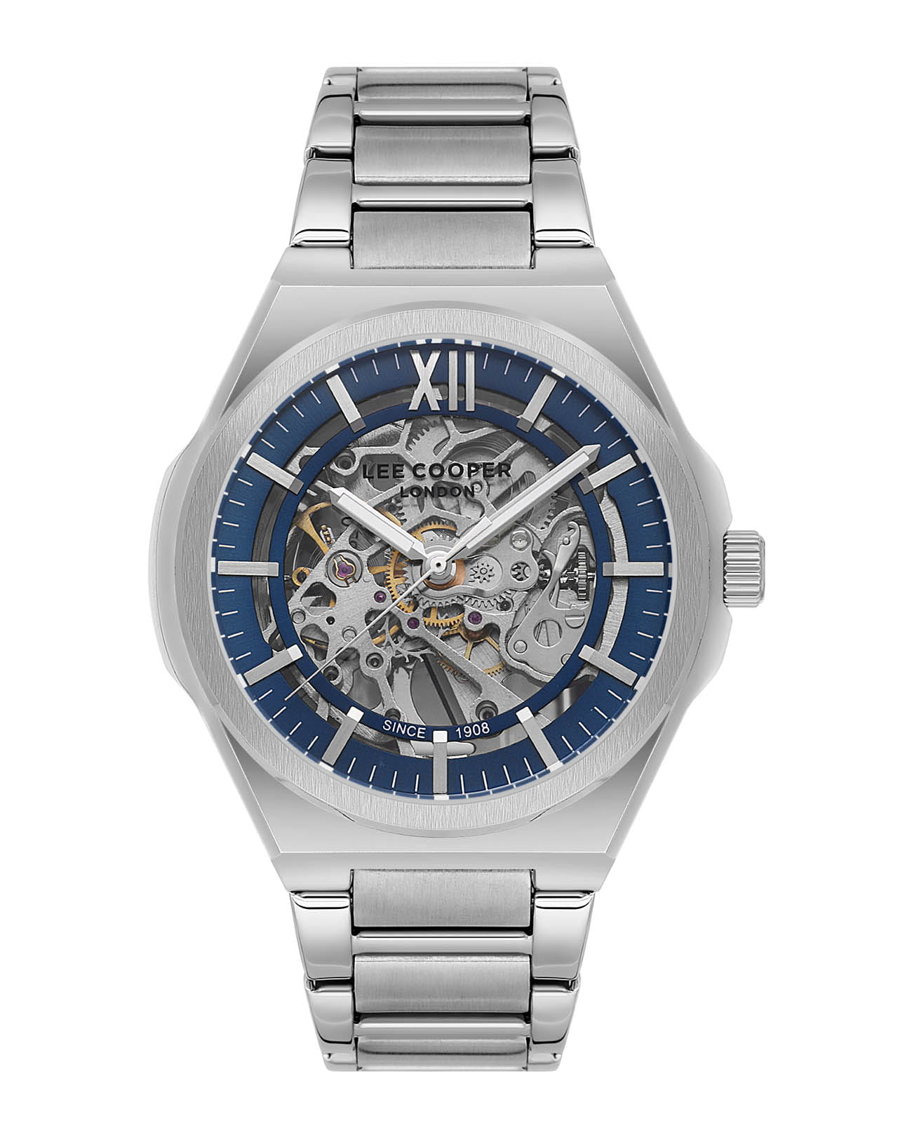 Мужские наручные часы Lee Cooper LC08051.390 — это стильная модель, сочетающая в себе современный дизайн и функциональность. Корпус часов выполнен из суперметалла серебристого цвета, что делает их устойчивыми к внешним воздействиям и придает благородный вид. Часы оснащены автоподзаводом, который заряжается от движения руки и обеспечивает высокую точность хода. Синий циферблат украшен скелетонизированным дизайном, позволяющим наблюдать за работой механизма, что делает часы не только функциональными, но и визуально привлекательными. Для защиты циферблата используется минеральное стеклоМинеральное стеклоМинеральное стекло представляет собой искусственно выращенный минерал кварца. Такое стекло отличается особой устойчивостью к повреждениям и царапинам. Уступает по некоторым качествам сапфировому стеклу., устойчивое к царапинам и механическим повреждениям. Корпус имеет круглую форму диаметром 43 мм, что делает часы заметными и подходящими для повседневного ношения. Браслет на раскладной застёжкеРаскладная застёжкаТакой тип застёжки используется только на браслетах из металла. Она никогда не раскрывается полностью, происходит разделение на 2 и более частей. Раскладывающая застёжка снизит вероятность потери часов к минимуму.. Модель обладает водонепроницаемостью до 50 метров (5 АТМ), что позволяет использовать часы в повседневной жизни, включая контакт с водой при мытье рук или дожде. Эти часы станут идеальным выбором для мужчин, ценящих стиль, качество и функциональность.