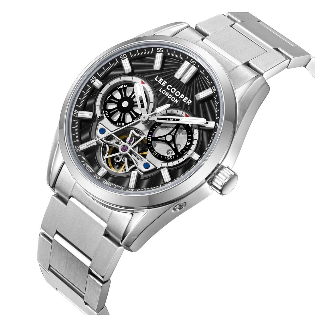 Мужские наручные часы-скелетоны Lee Cooper LC08181.350 механические с автоподзаводом, обеспечивающие высокую точность хода и надежность. Корпус часов выполнен из суперметалла серебристого цвета, диаметром 42 мм, что делает их устойчивыми к внешним воздействиям и придает благородный вид. Циферблат украшен классическими стрелками и метками с люминесцентным покрытиемЛюминесцентное покрытиеПозволяет считывать показания времени в темноте. Производители наносят на стрелки, часовые индексы, безель или поверхность циферблата светонакопительный состав, дающий холодное свечение., гармонично дополняющим общий дизайн модели. Для защиты циферблата используется минеральное стеклоМинеральное стеклоМинеральное стекло представляет собой искусственно выращенный минерал кварца. Такое стекло отличается особой устойчивостью к повреждениям и царапинам. Уступает по некоторым качествам сапфировому стеклу., устойчивое к царапинам и механическим повреждениям. Браслет из стали оснащен раскладной застёжкойРаскладная застёжкаТакой тип застёжки используется только на браслетах из металла. Она никогда не раскрывается полностью, происходит разделение на 2 и более частей. Раскладывающая застёжка снизит вероятность потери часов к минимуму., обеспечивающим комфортное и безопасное ношение. Часы обладают водонепроницаемостью до 50 метров (5 АТМ), что позволяет использовать их в повседневной жизни, включая контакт с водой при мытье рук или дожде. Эти часы станут идеальным выбором для мужчин, ценящих стиль, качество и функциональность.