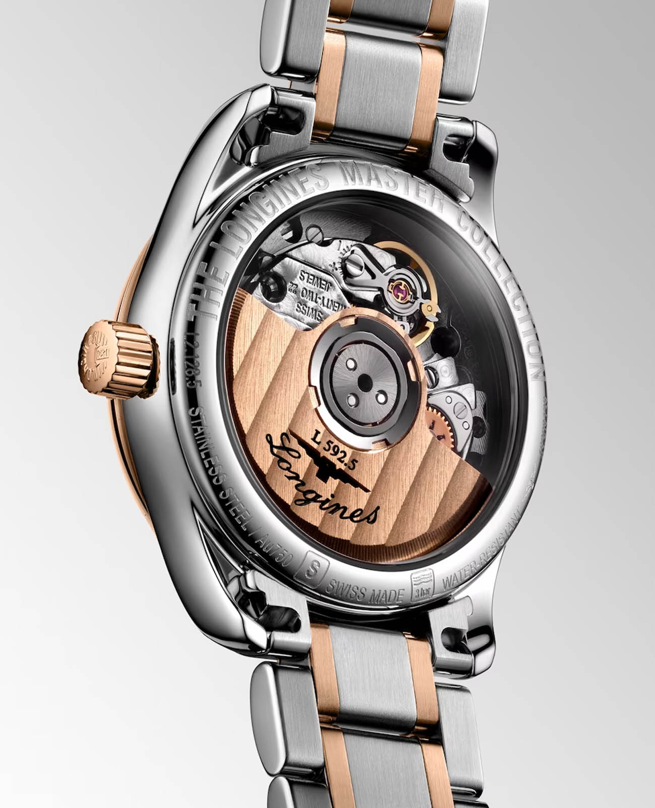 Женские швейцарские механические часы с автоподзаводом Longines Master Collection L2.128.5.59.7. Сапфировое стеклоСапфировое стеклоПрочный и надёжный материал из кристалла сапфира синтетического происхождения, характеризующийся особой твёрдостью и устойчивостью к царапинам и повреждениям. устойчивое к появлению царапин, обладающее высокой прозрачностью. Корпус часов изготовлен из нержавеющей стали. БезельБезельВнешний ободок, закрепляющий стекло. В спортивных часах так называется поворотное кольцо с делениями на циферблате, выполняет роль таймера – замеряет отрезки времени на шкале. Неподвижный безель – элемент декора. Однонаправленно вращающийся безель на дайверских часах позволяет фиксировать моменты погружения и выныривания на поверхность. с 18-каратным золотом18-каратное золотоОбозначение по каратной системе пробирования, оно показывает, сколько драгоценного металла содержится в изделии. 18 карат - в составе 75% чистого золота, соответствует 750 пробе.