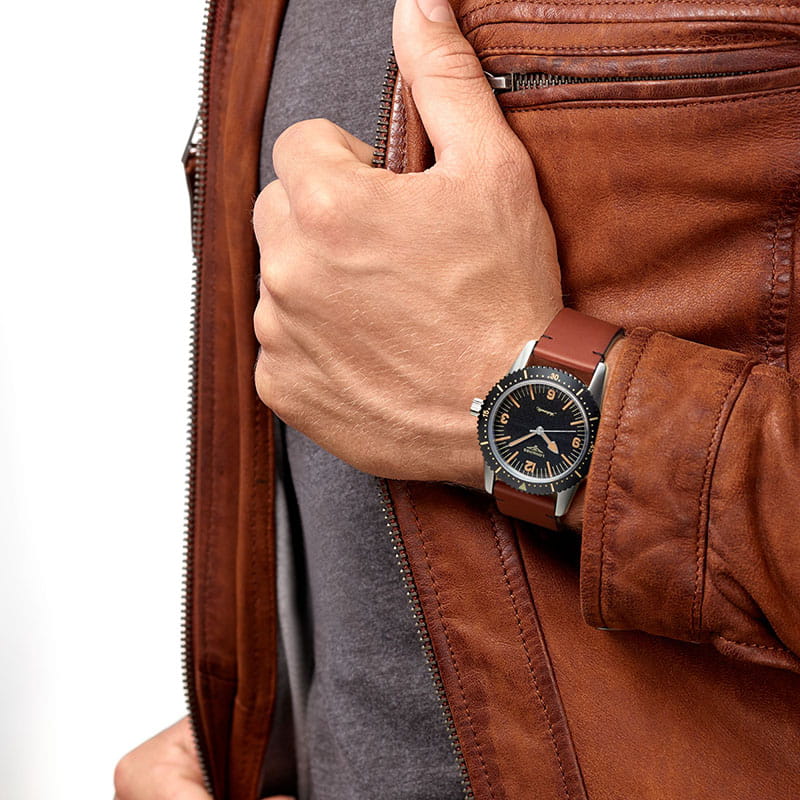Аксессуар выполнен в дайверском стиле: безельБезельВнешний ободок, закрепляющий стекло. В спортивных часах так называется поворотное кольцо с делениями на циферблате, выполняет роль таймера – замеряет отрезки времени на шкале. Неподвижный безель – элемент декора. Однонаправленно вращающийся безель на дайверских часах позволяет фиксировать моменты погружения и выныривания на поверхность., закручивающаяся задняя крышка, завинчивающаяся заводная головка, люминесцентная подсветкаЛюминесцентное покрытиеПозволяет считывать показания времени в темноте. Производители наносят на стрелки, часовые индексы, безель или поверхность циферблата светонакопительный состав, дающий холодное свечение.. Ремешок из натуральной кожи надёжно крепится на запястье. Швейцарский автоматический калибр L888 имеет запас хода на 64 часа. Сапфировое стекло дополнено многослойным антибликовым покрытиемАнтибликовое покрытиеСлой оксида металла в 0,13-0,3 микрон, благодаря которому стекло часов не бликует и не отражает свет. Антибликовое покрытие уменьшает отражение света в 10 раз, обеспечивая отличную читаемость показателей циферблата.. Водостойкость – 300 метров.