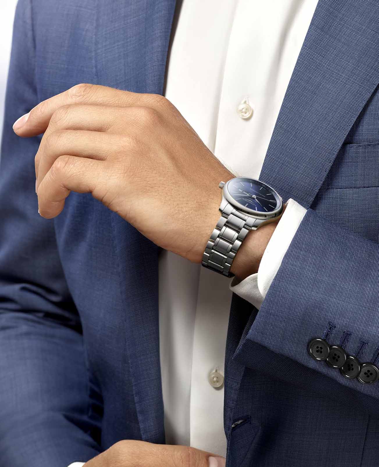 Часы Longines Master Collection Annual Calendar (артикул L29204926) сочетают в себе элегантность и функциональность, отражая богатое часовое наследие Longines. Корпус диаметром 42 мм выполнен из нержавеющей стали с водозащитой до 3 бар (30 метров). Синий циферблат с солнечным узором оснащён накладными индексами, серебристыми полированными стрелками и указателем месяца и даты в положении «3 часа». Циферблат защищён сапфировым стекломСапфировое стеклоПрочный и надёжный материал из кристалла сапфира синтетического происхождения, характеризующийся особой твёрдостью и устойчивостью к царапинам и повреждениям. с антибликовым покрытием.