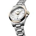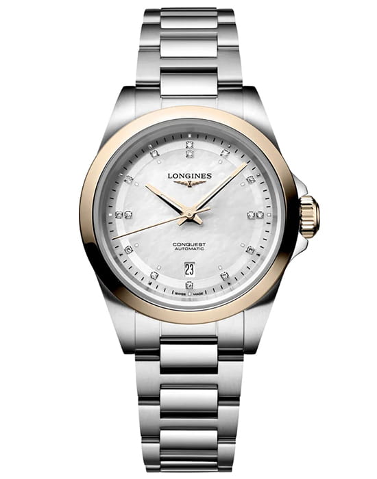 Longines Conquest L3.320.5.87.6 — женственные и выразительные часы, в которых строгость современной классики сочетается с благородной двухтональной отделкой. Корпус диаметром 34 мм изготовлен из нержавеющей стали и дополнен изящным безелем из 18-каратного розового золота, создающим тёплый контраст и подчёркивающим премиальный характер модели.
