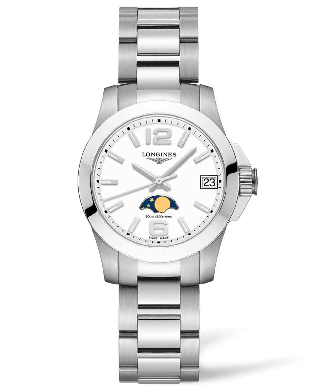 Женские швейцарские часы Longines Conquest L3.380.4.16.6 станут элегантным дополнением образа. Компактный циферблат защищён от царапин сапфировым стеклом с антибликовой обработкойАнтибликовое покрытиеСлой оксида металла в 0,13-0,3 микрон, благодаря которому стекло часов не бликует и не отражает свет. Антибликовое покрытие уменьшает отражение света в 10 раз, обеспечивая отличную читаемость показателей циферблата.. Сохранять водостойкость до 30 бар помогают закручивающаяся задняя крышка и завинчивающаяся заводная головка. Швейцарский кварцевый калибр L296 обеспечивает высокую точность хода. Дополнительные усложнения: календарь, индикатор EOLEOLПредставляет собой систему, уведомляющую владельца часов о необходимости замены элемента питания. За 2 недели до полного разряда батарейки секундная стрелка перестаёт ходить чётко и начинает перепрыгивать на 3-4 деления., отображение фаз луны.