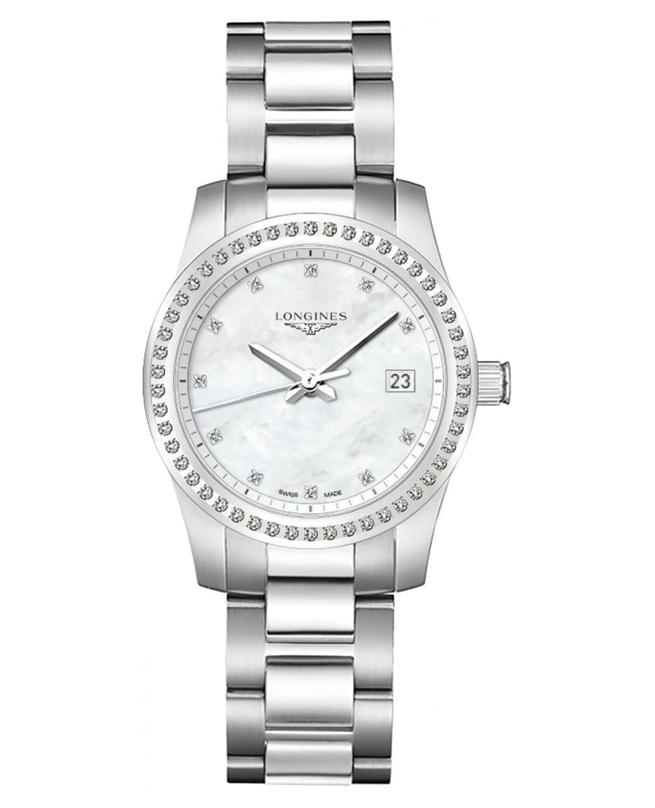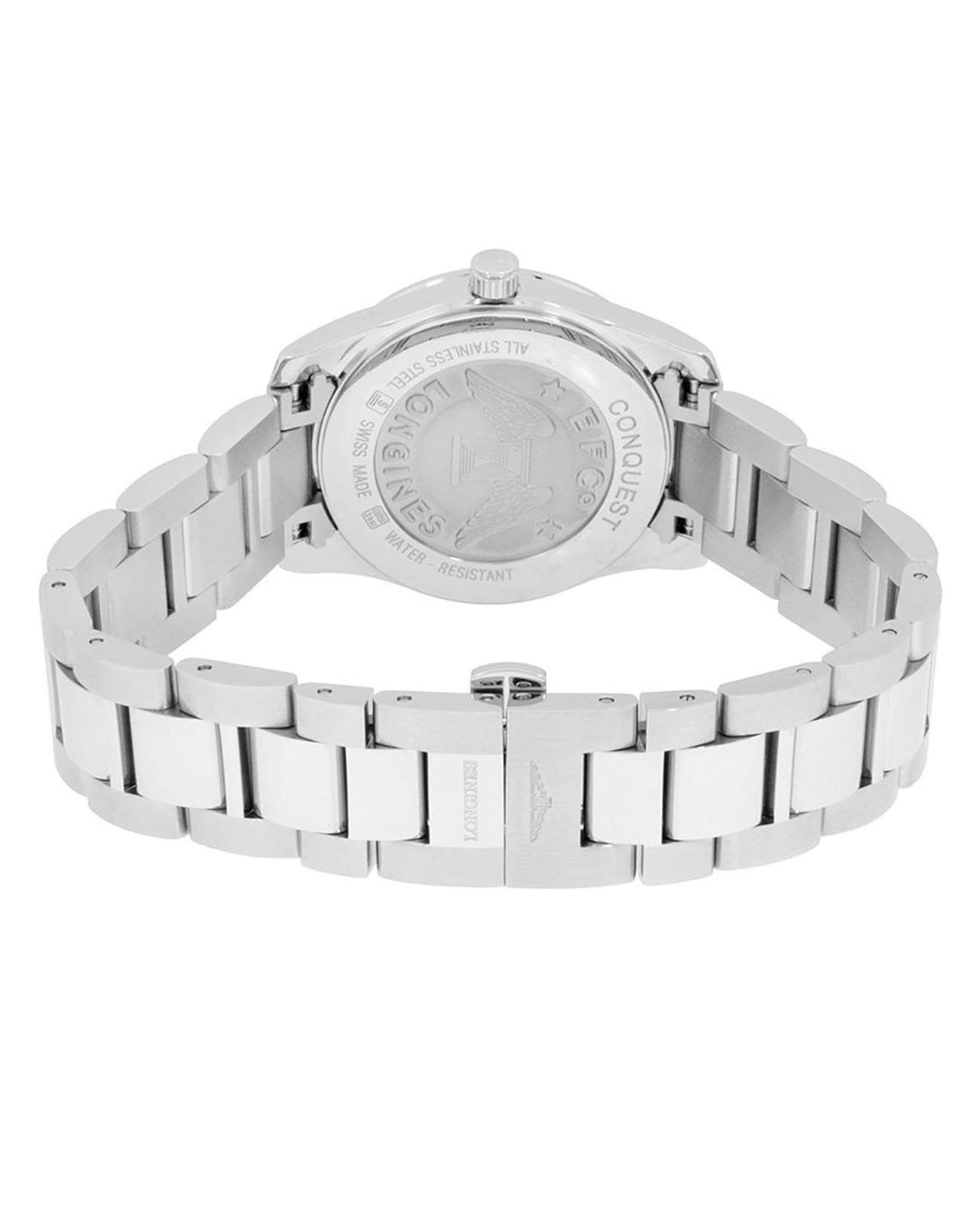 Женские швейцарские механические часы с автоподзаводом Longines Conquest L3.400.0.87.6. Сапфировое стеклоСапфировое стеклоПрочный и надёжный материал из кристалла сапфира синтетического происхождения, характеризующийся особой твёрдостью и устойчивостью к царапинам и повреждениям. устойчивое к появлению царапин, обладающее высокой прозрачностью. Корпус часов из нержавеющей стали украшен бриллиантами 0,420 карат. Циферблат инкрустирован 11 бриллиантами 0,036 карат. Окошко даты в положении 3 часов. Класс водозащиты: 300 метров, позволит плавать, нырять и заниматься другими водными видами спорта. Стальной браслет на застёжке «бабочка» с кнопкамиЗастёжка "бабочка"Такой вид застёжки дополняется предохранителями, помогающими избежать случайного раскрытия браслета. Обладают изящным исполнением. .