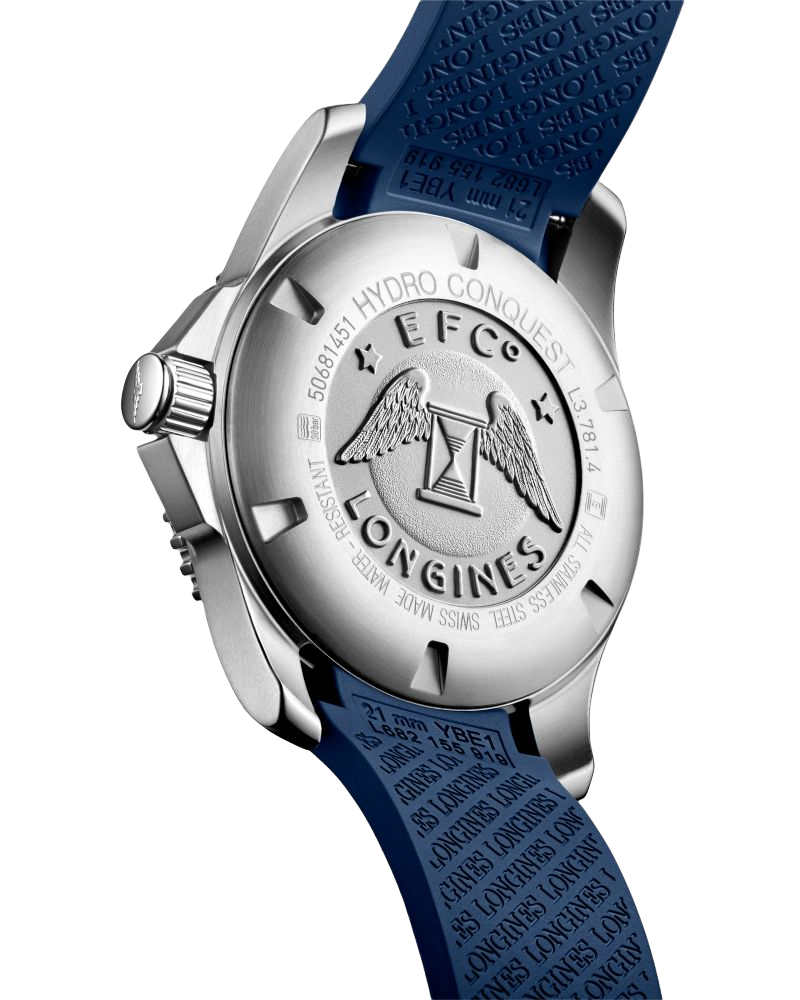 Мужские механические швейцарские часы с автоподзаводом Longines HydroConquest L3.781.4.96.9. Сапфировое стеклоСапфировое стеклоПрочный и надёжный материал из кристалла сапфира синтетического происхождения, характеризующийся особой твёрдостью и устойчивостью к царапинам и повреждениям. с антибликовым покрытием, устойчивое к мелким механическим повреждениям. Корпус часов изготовлен из нержавеющей стали. Вращающийся стальной безельБезельВнешний ободок, закрепляющий стекло. В спортивных часах так называется поворотное кольцо с делениями на циферблате, выполняет роль таймера – замеряет отрезки времени на шкале. Неподвижный безель – элемент декора. Однонаправленно вращающийся безель на дайверских часах позволяет фиксировать моменты погружения и выныривания на поверхность. с люминесцентным покрытиемЛюминесцентное покрытиеПозволяет считывать показания времени в темноте. Производители наносят на стрелки, часовые индексы, безель или поверхность циферблата светонакопительный состав, дающий холодное свечение. Superluminova из нержавеющей стали с PVD-покрытиемPVDУльтратонкое покрытие наносится в технике вакуумного напыления, сочетает в себе нитрид титана особой прочности со слоем золота или оксида хрома. Несёт в себе декоративную или защитную функцию. и керамики, защищенный от царапин, никогда не изнашивается и не выцветает. Стрелки и метки с люминесцентным покрытиемЛюминесцентное покрытиеПозволяет считывать показания времени в темноте. Производители наносят на стрелки, часовые индексы, безель или поверхность циферблата светонакопительный состав, дающий холодное свечение.. Окошко даты находится в положении 3 часа. Класс водозащиты: 300 метров, позволит плавать, нырять и заниматься другими водными видами спорта. Каучковый ремешок на раскладной застёжкеРаскладная застёжкаТакой тип застёжки используется только на браслетах из металла. Она никогда не раскрывается полностью, происходит разделение на 2 и более частей. Раскладывающая застёжка снизит вероятность потери часов к минимуму..