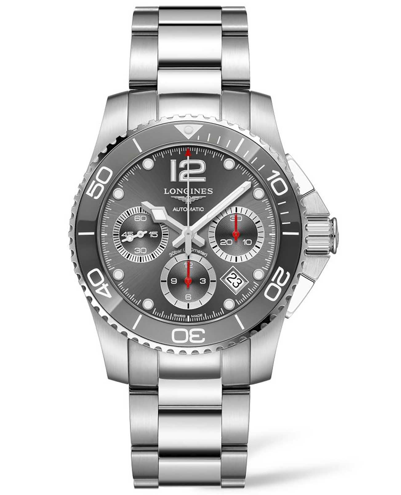 Керамический серый безельБезельВнешний ободок, закрепляющий стекло. В спортивных часах так называется поворотное кольцо с делениями на циферблате, выполняет роль таймера – замеряет отрезки времени на шкале. Неподвижный безель – элемент декора. Однонаправленно вращающийся безель на дайверских часах позволяет фиксировать моменты погружения и выныривания на поверхность. идеально сочетается с корпусом из стали 316L. Швейцарский автоматический механизм L688 характеризуется запасом хода на 54 часа и обеспечивает высокую точность показателей. Сапфировое стекло дополнено многослойным антибликовым покрытиемАнтибликовое покрытиеСлой оксида металла в 0,13-0,3 микрон, благодаря которому стекло часов не бликует и не отражает свет. Антибликовое покрытие уменьшает отражение света в 10 раз, обеспечивая отличную читаемость показателей циферблата.. Особенности: люминесцентная подсветкаЛюминесцентное покрытиеПозволяет считывать показания времени в темноте. Производители наносят на стрелки, часовые индексы, безель или поверхность циферблата светонакопительный состав, дающий холодное свечение., календарь, хронографХронографФункция позволяет измерять отрезки времени с особой точностью: часы, минуты, секунды. Верным признаком хронографа является наличие на циферблате 3 дополнительных окошек-счётчиков..