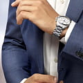 Дополнительные особенности: сапфировое стеклоСапфировое стеклоПрочный и надёжный материал из кристалла сапфира синтетического происхождения, характеризующийся особой твёрдостью и устойчивостью к царапинам и повреждениям. с двухсторонним антибликовым покрытиемАнтибликовое покрытиеСлой оксида металла в 0,13-0,3 микрон, благодаря которому стекло часов не бликует и не отражает свет. Антибликовое покрытие уменьшает отражение света в 10 раз, обеспечивая отличную читаемость показателей циферблата. и люминесцентной подсветкойЛюминесцентное покрытиеПозволяет считывать показания времени в темноте. Производители наносят на стрелки, часовые индексы, безель или поверхность циферблата светонакопительный состав, дающий холодное свечение.. Часы показывают время, минуты и малую секундную стрелку, расположенную на отметке 9 часов. Класс водозащиты: 100 метров, что позволяет плавать, нырять и заниматься другими водными видами спорта. Стальной браслет на раскладной застёжкеРаскладная застёжкаТакой тип застёжки используется только на браслетах из металла. Она никогда не раскрывается полностью, происходит разделение на 2 и более частей. Раскладывающая застёжка снизит вероятность потери часов к минимуму..