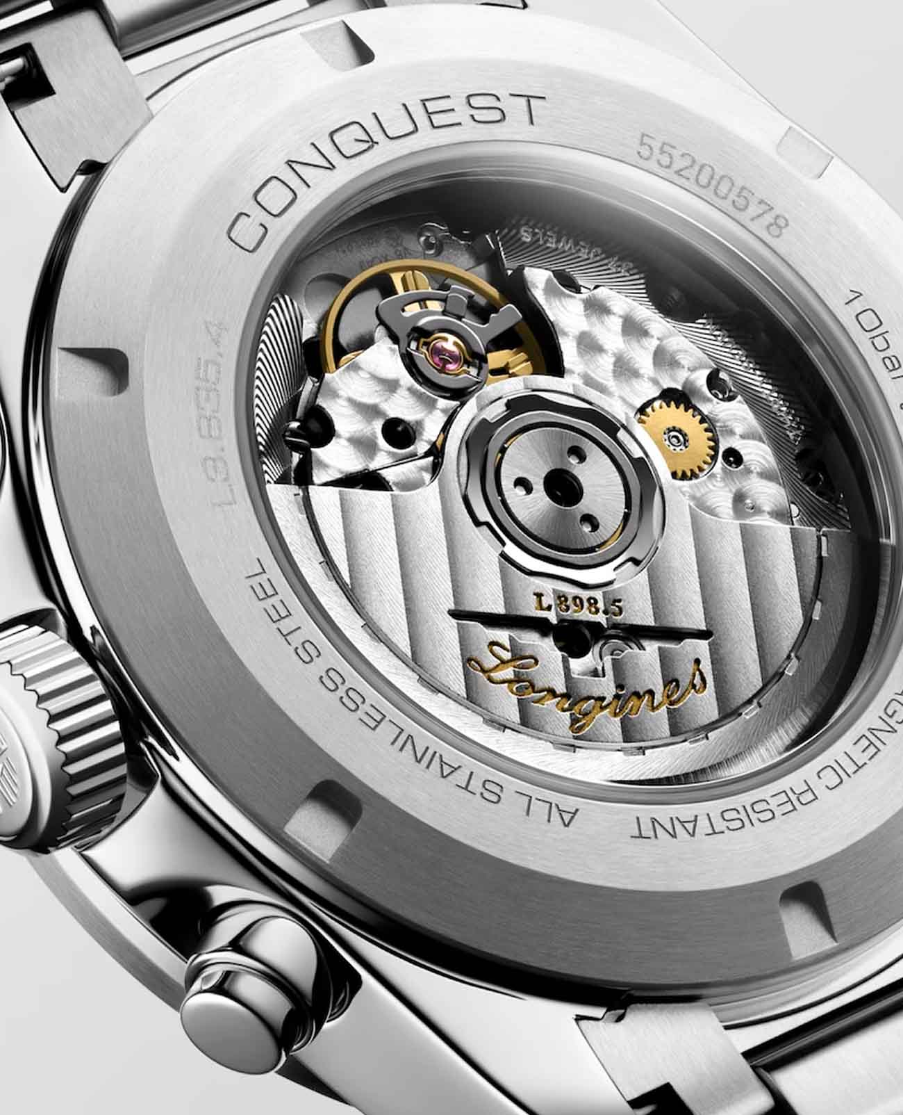 Мужские швейцарские механические часы- хронографХронографФункция позволяет измерять отрезки времени с особой точностью: часы, минуты, секунды. Верным признаком хронографа является наличие на циферблате 3 дополнительных окошек-счётчиков. Longines Conquest L3.835.4.92.6. Сапфировое стеклоСапфировое стеклоПрочный и надёжный материал из кристалла сапфира синтетического происхождения, характеризующийся особой твёрдостью и устойчивостью к царапинам и повреждениям. с многослойным антибликовым покрытием с обеих сторон, устойчивое к появлению царапин, обладающее высокой прозрачностью. Корпус часов изготовлен из стали. Неподвижный безельБезельВнешний ободок, закрепляющий стекло. В спортивных часах так называется поворотное кольцо с делениями на циферблате, выполняет роль таймера – замеряет отрезки времени на шкале. Неподвижный безель – элемент декора. Однонаправленно вращающийся безель на дайверских часах позволяет фиксировать моменты погружения и выныривания на поверхность. из стали и керамики, защищенный от царапин, никогда не изнашивается и не выцветает. Шкала тахиметрТахиметрРазмеченная шкала, располагается на ободке или безеле часов. Тахиметр позволяет рассчитать скорость на определённом участке пути, расстояние измеряется в километрах или милях.. На циферблате расположены три дополнительных индикатора. Стрелки и метки с люминесцентным покрытиемЛюминесцентное покрытиеПозволяет считывать показания времени в темноте. Производители наносят на стрелки, часовые индексы, безель или поверхность циферблата светонакопительный состав, дающий холодное свечение.. Класс водозащиты: 100 метров, позволит плавать, нырять и заниматься другими водными видами спорта. Стальной браслет на раскладной застёжкеРаскладная застёжкаТакой тип застёжки используется только на браслетах из металла. Она никогда не раскрывается полностью, происходит разделение на 2 и более частей. Раскладывающая застёжка снизит вероятность потери часов к минимуму..