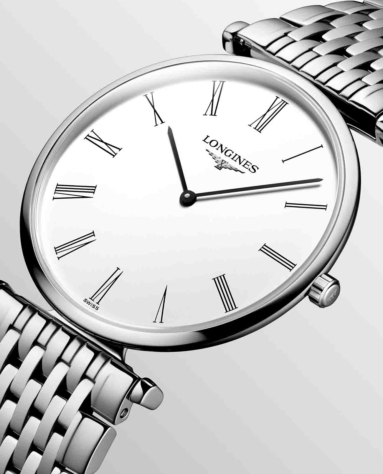 Белый циферблат дополнен контрастными стрелками и винтажными римскими цифрами. Швейцарский кварцевый калибр L420 отличается абсолютной точностью хода. Стекло из сапфира устойчиво к царапинам.
