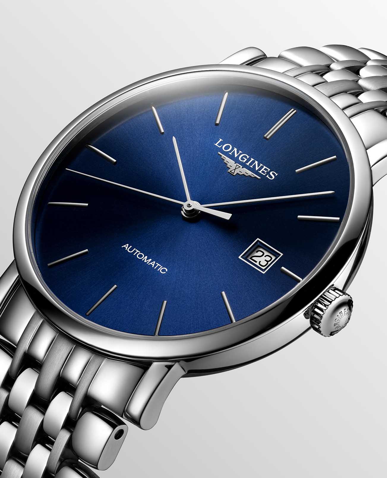 Часы Longines Elegant Collection (артикул L4.910.4.92.6) сочетают изысканный дизайн и высокое часовое мастерство. Корпус диаметром 39 мм выполнен из нержавеющей стали, оснащён прозрачной задней крышкой из сапфирового стеклаСапфировое стеклоПрочный и надёжный материал из кристалла сапфира синтетического происхождения, характеризующийся особой твёрдостью и устойчивостью к царапинам и повреждениям., что позволяет наблюдать за работой механизма. Водозащита составляет 3 бар (30 метров). Синий циферблат с солнечным узором украшен накладными часовыми метками и серебристыми полированными стрелками, а окошко даты расположено в позиции «3 часа». Циферблат защищён сапфировым стекломСапфировое стеклоПрочный и надёжный материал из кристалла сапфира синтетического происхождения, характеризующийся особой твёрдостью и устойчивостью к царапинам и повреждениям..