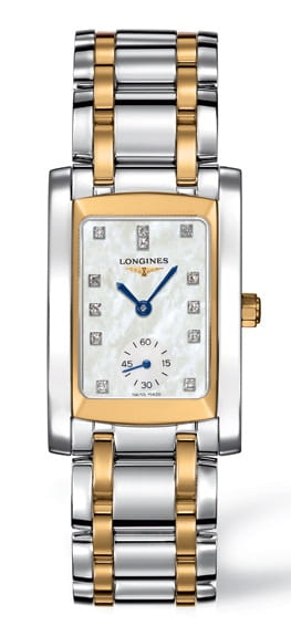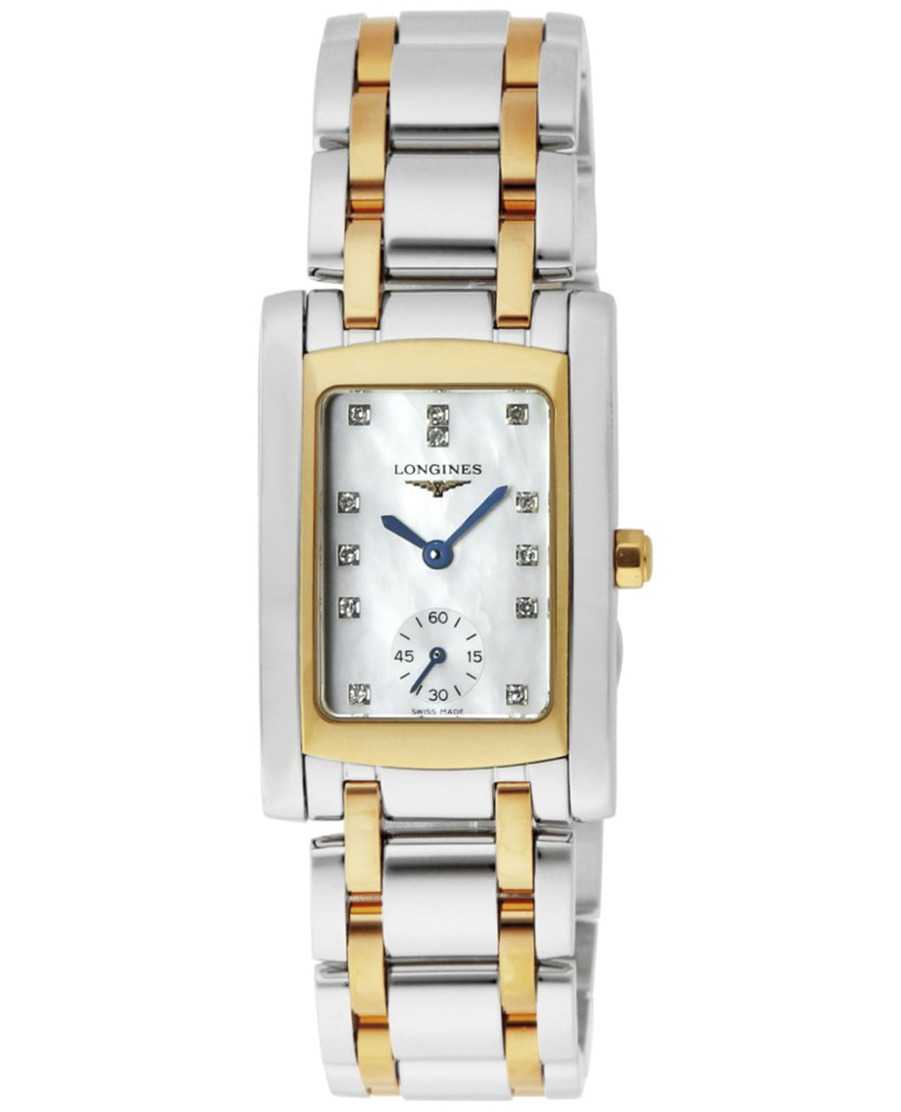 Женские швейцарские кварцевые часы с бриллиантами Longines DolceVita L5.502.5.08.7, кварцевый механизм с высокой точностью. Сапфировое стеклоСапфировое стеклоПрочный и надёжный материал из кристалла сапфира синтетического происхождения, характеризующийся особой твёрдостью и устойчивостью к царапинам и повреждениям.  устойчивое к появлению царапин, обладающее высокой прозрачностью. Класс водозащиты: 30 метров, позволит защитить корпус от случайных брызг или капель дождя. Корпус часов изготовлен из стали с 18-каратным золотом18-каратное золотоОбозначение по каратной системе пробирования, оно показывает, сколько драгоценного металла содержится в изделии. 18 карат - в составе 75% чистого золота, соответствует 750 пробе.