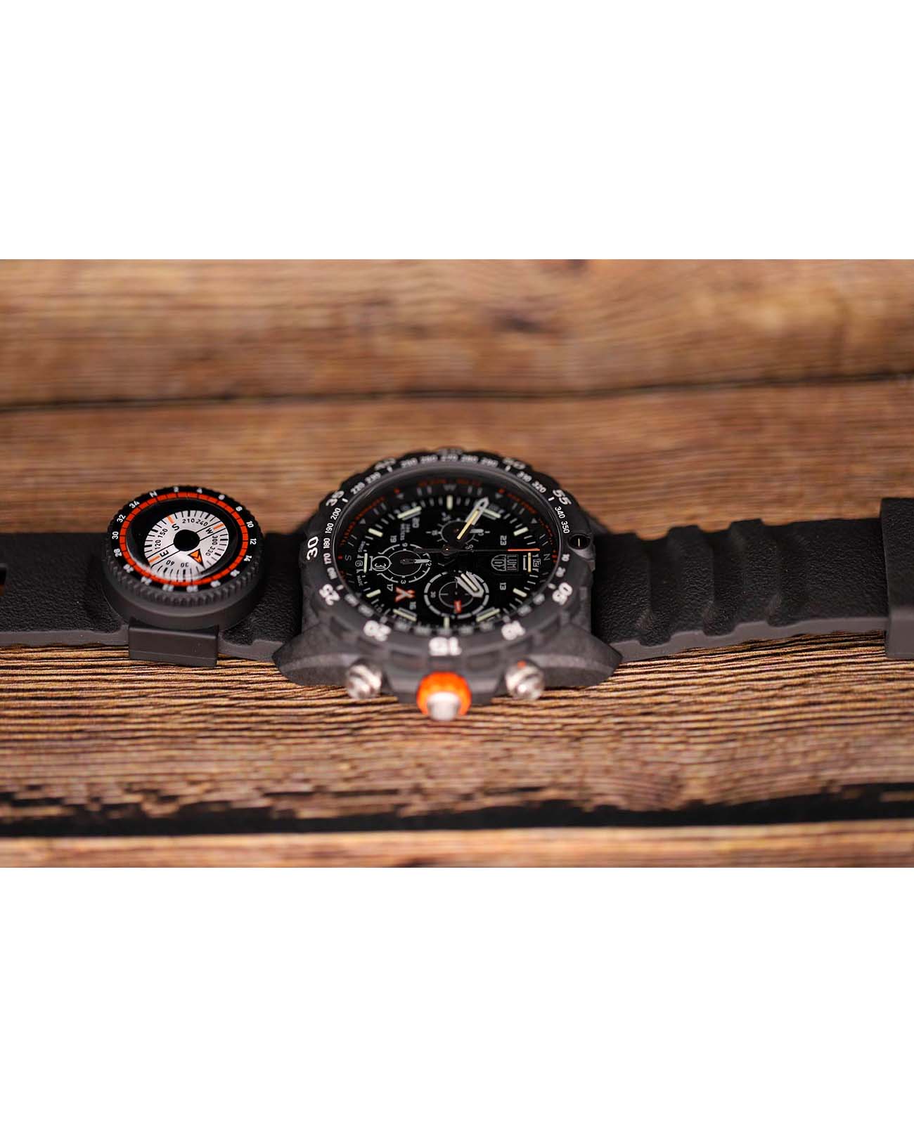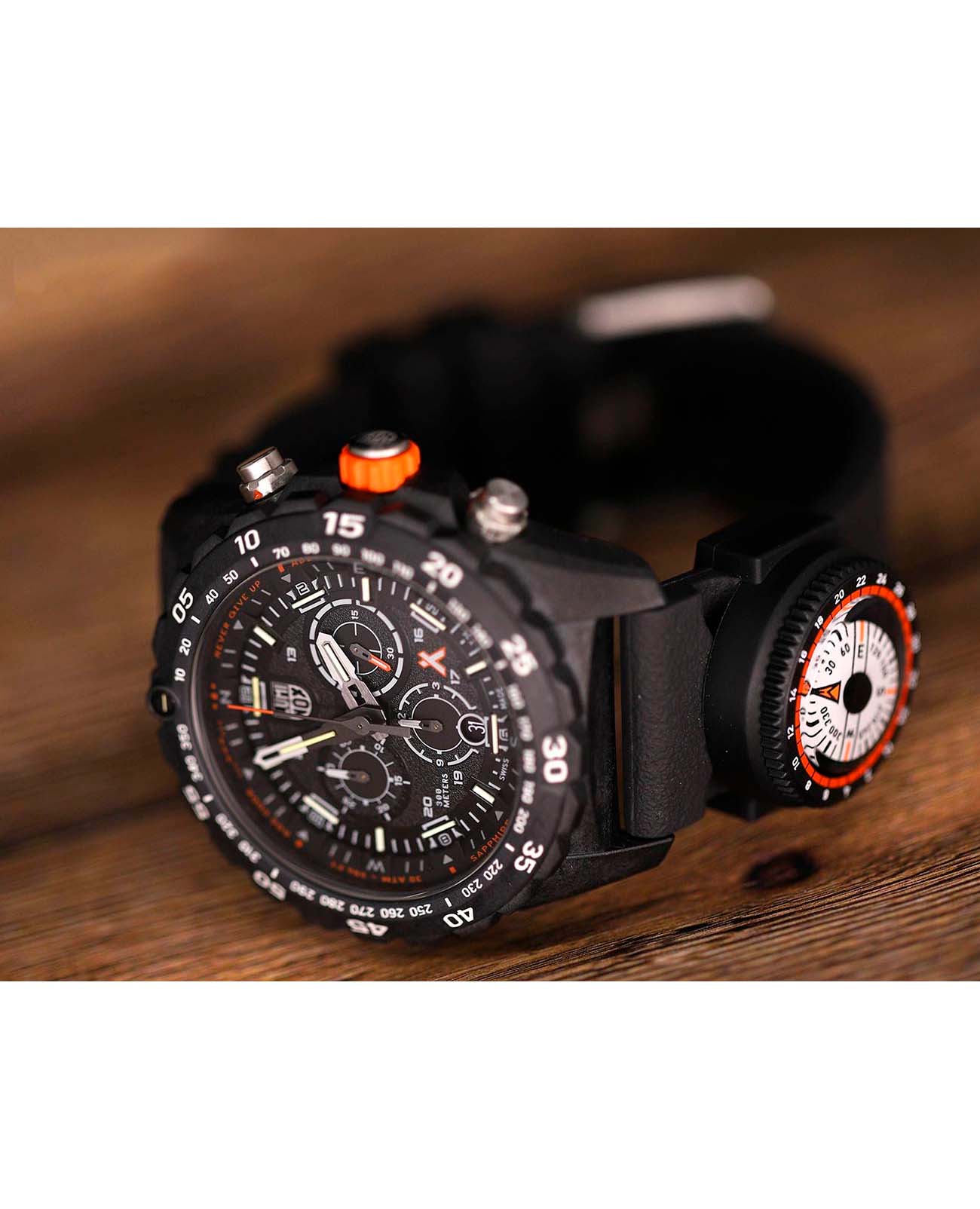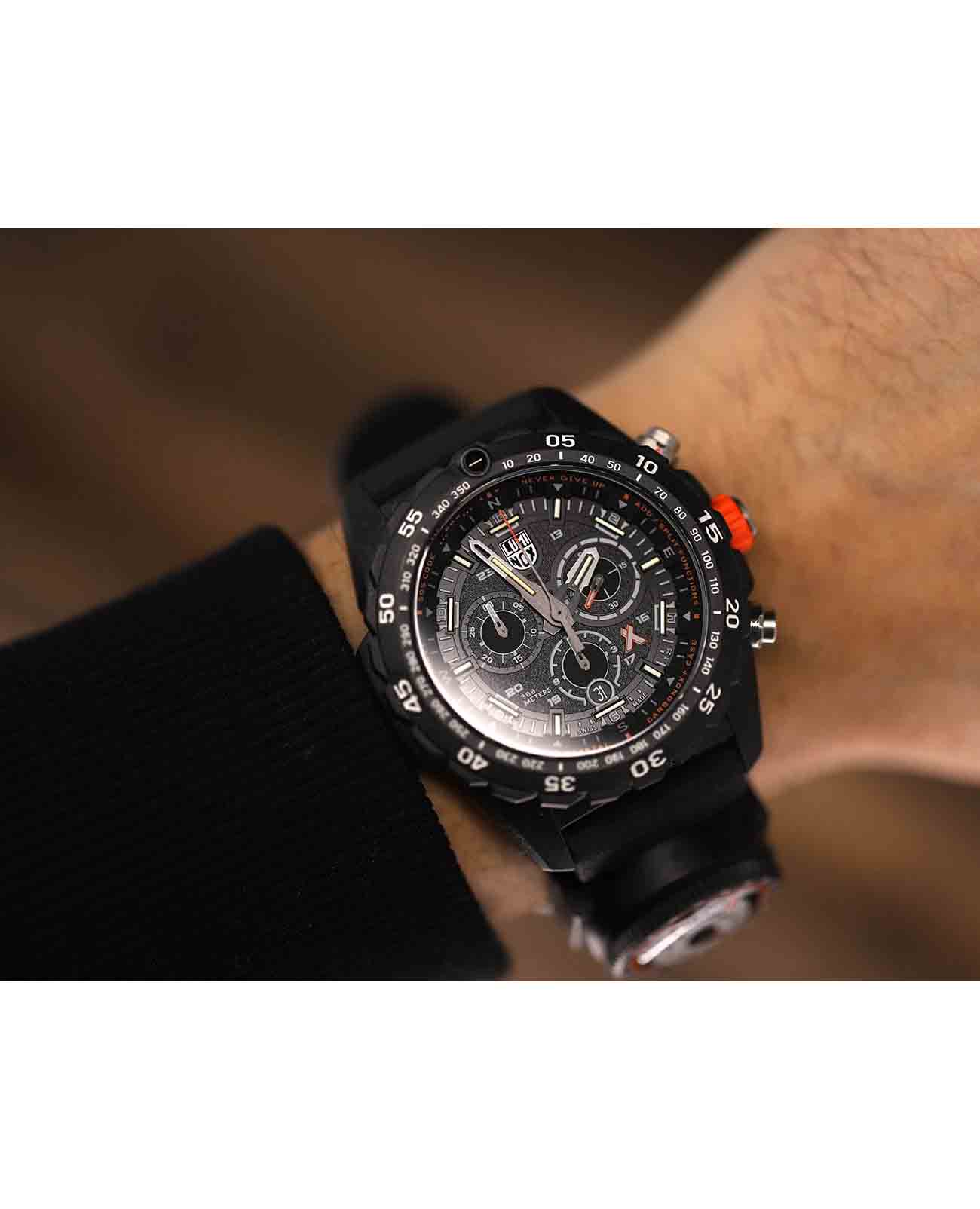 Мужские наручные часы-хронографХронографФункция позволяет измерять отрезки времени с особой точностью: часы, минуты, секунды. Верным признаком хронографа является наличие на циферблате 3 дополнительных окошек-счётчиков. Luminox Bear Grylls Survival XB.3741 представляют собой идеальный выбор для тех, кто ведет активный образ жизни и ценит надежность и функциональность. Модель обладает круглым корпусом диаметром 45 мм, изготовленным из прочного карбона черного цвета, который обеспечивает высокую устойчивость к внешним воздействиям и легкость конструкции. Браслет выполнен из полиуретана черного цвета на стандартной застежке, гарантирующей комфортное ношение и безопасность. Циферблат черного цвета оснащен крупными индексами и стрелками с люминесцентным покрытиемЛюминесцентное покрытиеПозволяет считывать показания времени в темноте. Производители наносят на стрелки, часовые индексы, безель или поверхность циферблата светонакопительный состав, дающий холодное свечение., что позволяет легко читать время даже в условиях недостаточной освещенности. Для защиты используется сапфировое стеклоСапфировое стеклоПрочный и надёжный материал из кристалла сапфира синтетического происхождения, характеризующийся особой твёрдостью и устойчивостью к царапинам и повреждениям. с антибликовым покрытиемАнтибликовое покрытиеСлой оксида металла в 0,13-0,3 микрон, благодаря которому стекло часов не бликует и не отражает свет. Антибликовое покрытие уменьшает отражение света в 10 раз, обеспечивая отличную читаемость показателей циферблата., обеспечивающее прочную защиту от царапин и четкое чтение времени при любых условиях освещения. Часы работают на кварцевом механизме, который обеспечивает точное время без необходимости подзаводки. Модель также оснащена функцией второго часового поясаВторой часовой поясФункция, позволяющая отображать время двух часовых поясов одновременно., делая ее удобной для путешествий. Водонепроницаемость часов достигает 300 метров (30 атмосфер), что позволяет использовать их при плавании, дайвинге и других водных видах спорта. Luminox XB.3741 — это не просто аксессуар, а инструмент для выживания, созданный в сотрудничестве с Bear Grylls, который сочетает в себе надежность, функциональность и стильный дизайн.