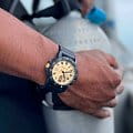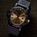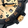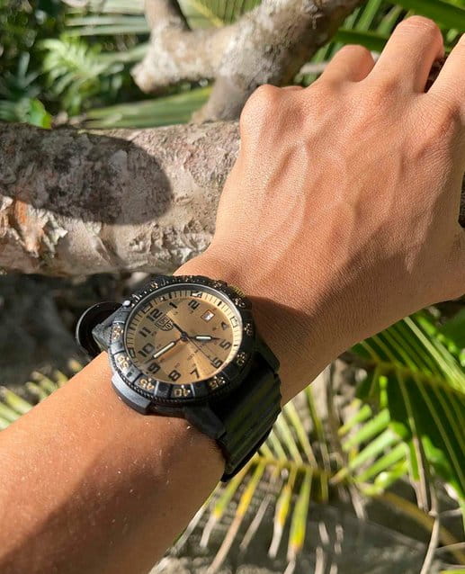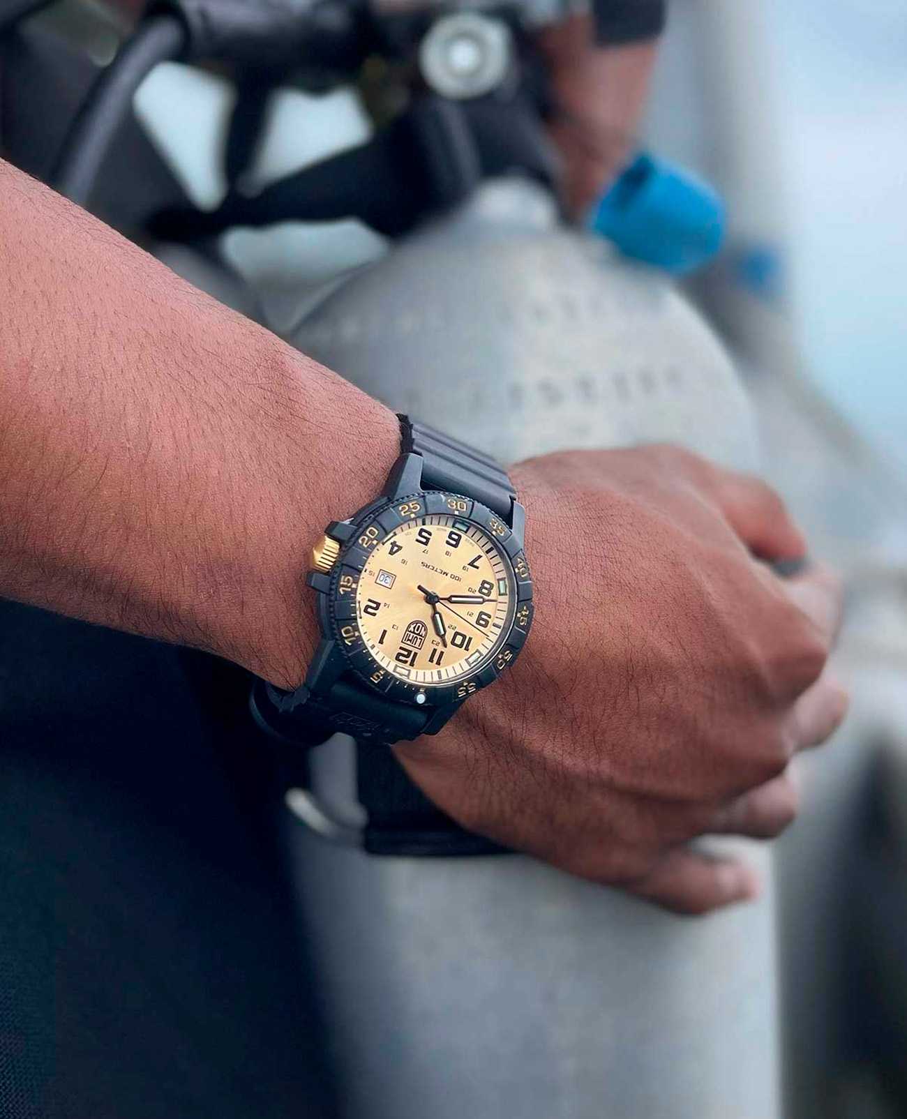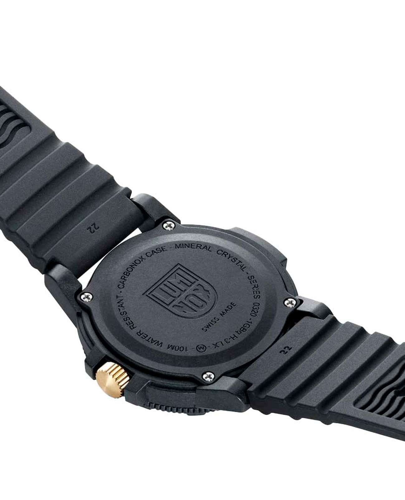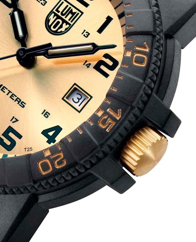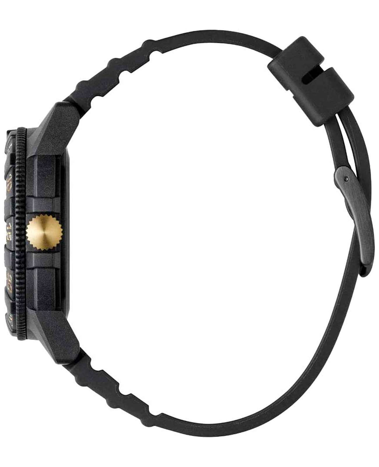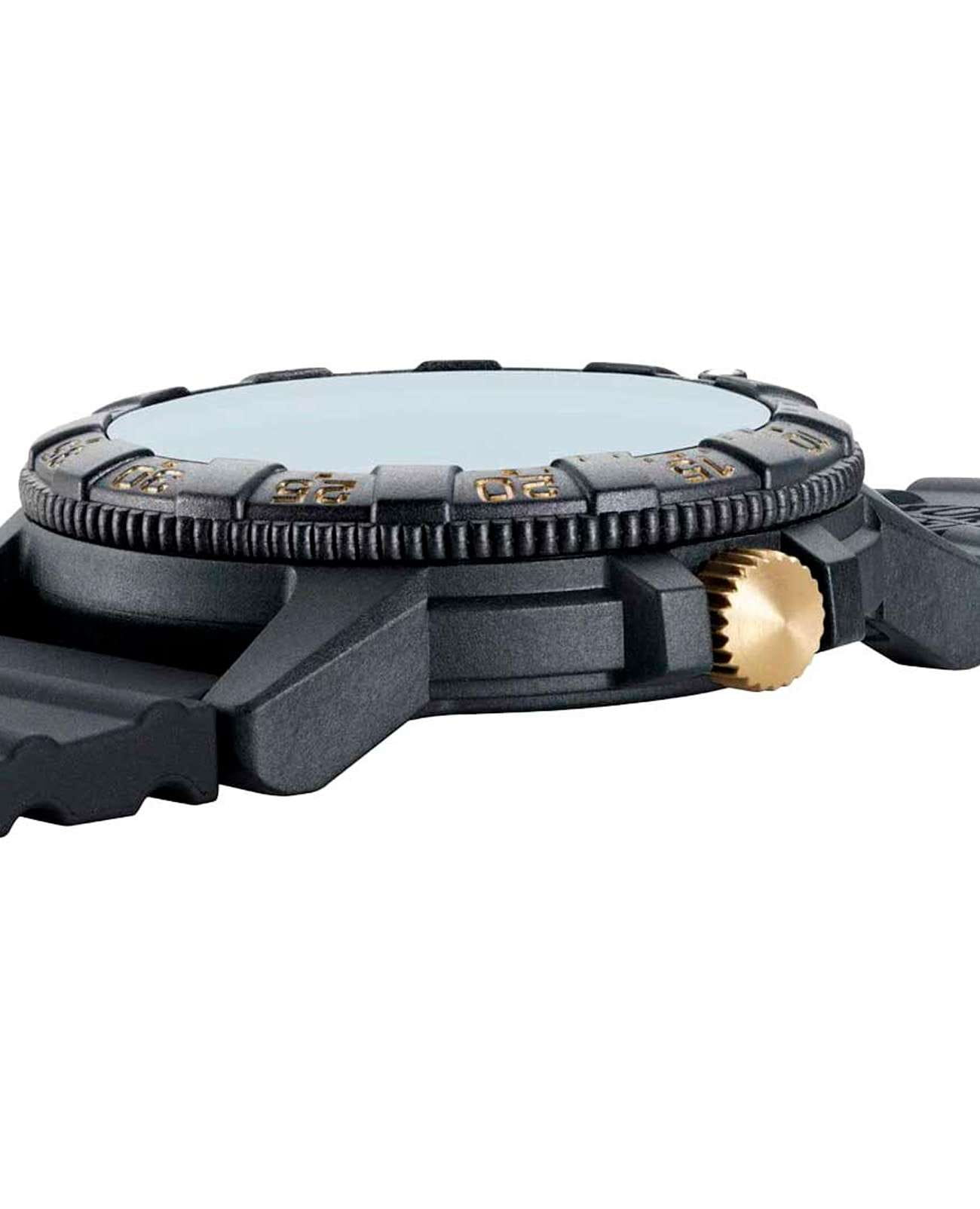 Мужские наручные часы Luminox XS.0325.GP из коллекции Leatherback SEA Turtle Giant сочетают в себе спортивный дизайн и надежность швейцарского качества. Модель обладает круглым корпусом диаметром 44 мм, изготовленным из карбонаКарбонОт «carbon», «carbone» - углерод, углепластик - полимерный композиционный материал из переплетённых под определенным углом между собой нитей углеродного волокна, применяется для изготовления лёгких, но прочных деталей. В часах часто используют для украшения циферблатов и ремешков. Так же карбон используется в изготовлении корпусов. Такие корпуса обладают антикоррозионным свойством, не поддаются электромагнитному излучению, обладают повышенной прочностью и противоударностью. (CARBONOX™), что обеспечивает высокую устойчивость к внешним воздействиям при сохранении легкости. Циферблат золотистого цвета украшен контрастными черными метками и стрелками с , гарантирующим постоянную видимость времени даже в условиях низкой освещенности. Часы оснащены кварцевым механизмом швейцарского производства, обеспечивающим точность хода ±15 секунд в месяц. Защиту циферблата обеспечивает прочное минеральное стеклоМинеральное стеклоМинеральное стекло представляет собой искусственно выращенный минерал кварца. Такое стекло отличается особой устойчивостью к повреждениям и царапинам. Уступает по некоторым качествам сапфировому стеклу., устойчивое к царапинам и механическим повреждениям. Водонепроницаемость модели достигает 10 атмосфер (100 метров), что делает их подходящими для плавания и активного отдыха на воде. Модель также оснащена безелемБезельВнешний ободок, закрепляющий стекло. В спортивных часах так называется поворотное кольцо с делениями на циферблате, выполняет роль таймера – замеряет отрезки времени на шкале. Неподвижный безель – элемент декора. Однонаправленно вращающийся безель на дайверских часах позволяет фиксировать моменты погружения и выныривания на поверхность. с односторонним вращением, что добавляет функциональности при использовании в водных условиях. Ремешок выполнен из полиуретана (PU) с нержавеющей стальной застежкой, что обеспечивает комфортное ношение в течение дня. Дополнительно часы имеют окно даты в положении «3 часа», что делает их практичными для повседневного использования.