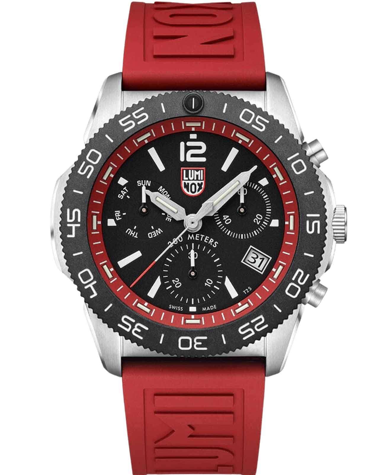 Швейцарские наручные часы Luminox Pacific Diver Chronograph XS.3155.SET – это идеальный симбиоз стиля и высокой функциональности. Оснащенные высокоточным кварцевым механизмом, они гарантируют безупречное времяизмерение и надежность в любом случае. Часы-хронографХронографФункция позволяет измерять отрезки времени с особой точностью: часы, минуты, секунды. Верным признаком хронографа является наличие на циферблате 3 дополнительных окошек-счётчиков. обладают функцией секундомераСекундомерСекундоме́р — прибор, способный измерять интервалы времени с точностью до долей секунды., что делает их практичными в использовании. Циферблат этих часов защищен сапфировым стекломСапфировое стеклоПрочный и надёжный материал из кристалла сапфира синтетического происхождения, характеризующийся особой твёрдостью и устойчивостью к царапинам и повреждениям. с антибликовым покрытиемАнтибликовое покрытиеСлой оксида металла в 0,13-0,3 микрон, благодаря которому стекло часов не бликует и не отражает свет. Антибликовое покрытие уменьшает отражение света в 10 раз, обеспечивая отличную читаемость показателей циферблата., которое славится своей прочностью и устойчивостью к царапинам, обеспечивая кристально чистый обзор. Корпус часов выполнен из качественной стали, что свидетельствует о долговечности и прочности изделия. Стрелки с LLTLLTLLT — это автономный механизм подсветки, основанный на использовании микроскопических газонаполненных элементов. Специальные герметичные капсулы из боросиликатного стекла, интегрированные в циферблат, генерируют свечение без необходимости подключения к внешним источникам энергии. Для их работы не требуется ни дополнительный свет, ни механическое воздействие (например, нажатие кнопки). Свечение возникает благодаря химическому процессу: реакция между тритием, заключенным в капсулах, и люминофорным покрытием создает стабильное автономное освещение. Технология обеспечивает энергетическую независимость и долговечность подсветки.-подсветкой, обеспечивают отличную видимость даже в условиях недостаточной освещенности, что делает их удобными для использования в любых условиях. Дополнительно часы располагают окошком даты в положении 4 часа, позволяющим быстро и удобно отслеживать текущую дату. Их внушительный класс водозащиты в 200 метров делает их идеальными для любителей водных видов спорта, таких как плавание и ныряние, не беспокоясь о повреждении механизма. Каучуковый красный ремешок, надёжно фиксирующий часы на запястье с помощью раскладной застёжкиРаскладная застёжкаТакой тип застёжки используется только на браслетах из металла. Она никогда не раскрывается полностью, происходит разделение на 2 и более частей. Раскладывающая застёжка снизит вероятность потери часов к минимуму., обеспечивает комфортное ношение в течение всего дня. Стильный вращающийся безельБезельВнешний ободок, закрепляющий стекло. В спортивных часах так называется поворотное кольцо с делениями на циферблате, выполняет роль таймера – замеряет отрезки времени на шкале. Неподвижный безель – элемент декора. Однонаправленно вращающийся безель на дайверских часах позволяет фиксировать моменты погружения и выныривания на поверхность., изготовленный из карбонаКарбонОт «carbon», «carbone» - углерод, углепластик - полимерный композиционный материал из