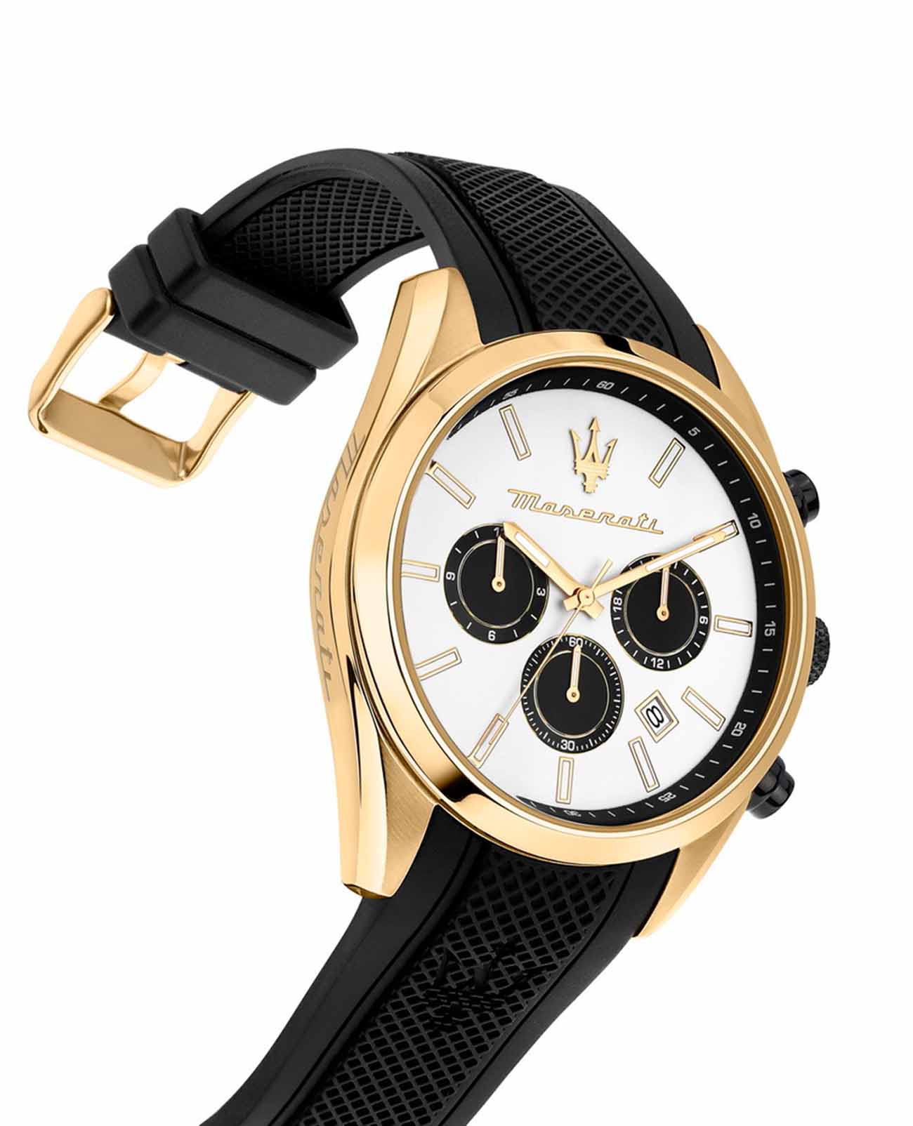 Мужские итальянские часы c хронографомХронографФункция позволяет измерять отрезки времени с особой точностью: часы, минуты, секунды. Верным признаком хронографа является наличие на циферблате 3 дополнительных окошек-счётчиков. Maserati Attrazione R8851151001, кварцевый механизм с высокой точностью. Корпус часов изготовлен из стали с PVD-покрытиемPVDУльтратонкое покрытие наносится в технике вакуумного напыления, сочетает в себе нитрид титана особой прочности со слоем золота или оксида хрома. Несёт в себе декоративную или защитную функцию.. Стрелки с люминесцентным покрытиемЛюминесцентное покрытиеПозволяет считывать показания времени в темноте. Производители наносят на стрелки, часовые индексы, безель или поверхность циферблата светонакопительный состав, дающий холодное свечение.. Класс водозащиты: 50 метров, позволит защитить корпус от случайных брызг или капель дождя. Каучуковый ремешок на стандартной застежке.