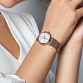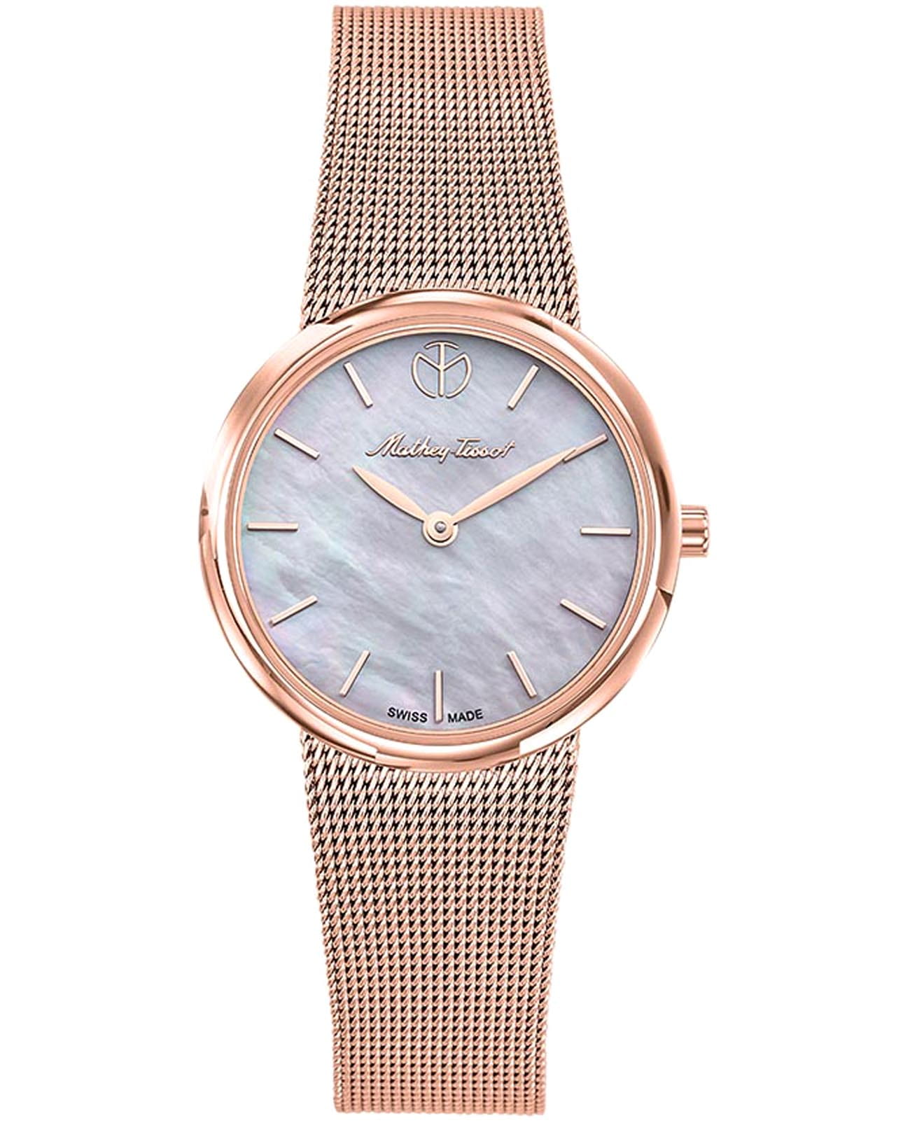 Женские кварцевые часы Mathey-Tissot Milly D403PI — это стильное сочетание элегантности и современного дизайна. Изящный корпус выполнен из нержавеющей стали с PVD-покрытиемPVDУльтратонкое покрытие наносится в технике вакуумного напыления, сочетает в себе нитрид титана особой прочности со слоем золота или оксида хрома. Несёт в себе декоративную или защитную функцию. цвета розового золота, диаметром 30 мм, что придаст образу элегантности и надежности. Изысканный перламутровый циферблат с метками в виде штрихов придает модели особый блеск. Циферблат защищен минеральным стекломМинеральное стеклоМинеральное стекло представляет собой искусственно выращенный минерал кварца. Такое стекло отличается особой устойчивостью к повреждениям и царапинам. Уступает по некоторым качествам сапфировому стеклу. с сапфировым покрытием, обеспечивает устойчивость к царапинам. Часы оснащены надежным кварцевым механизмом. Стальной браслет с PVD-покрытиемPVDУльтратонкое покрытие наносится в технике вакуумного напыления, сочетает в себе нитрид титана особой прочности со слоем золота или оксида хрома. Несёт в себе декоративную или защитную функцию. миланского плетения на раскладном замкеРаскладная застёжкаТакой тип застёжки используется только на браслетах из металла. Она никогда не раскрывается полностью, происходит разделение на 2 и более частей. Раскладывающая застёжка снизит вероятность потери часов к минимуму., гарантирует комфортное и безопасное ношение. Класс водозащиты: 30 метров позволит защитить корпус от случайных брызг или капель дождя. Mathey-Tissot — отличный выбор для тех, кто ценит утонченность и качество.