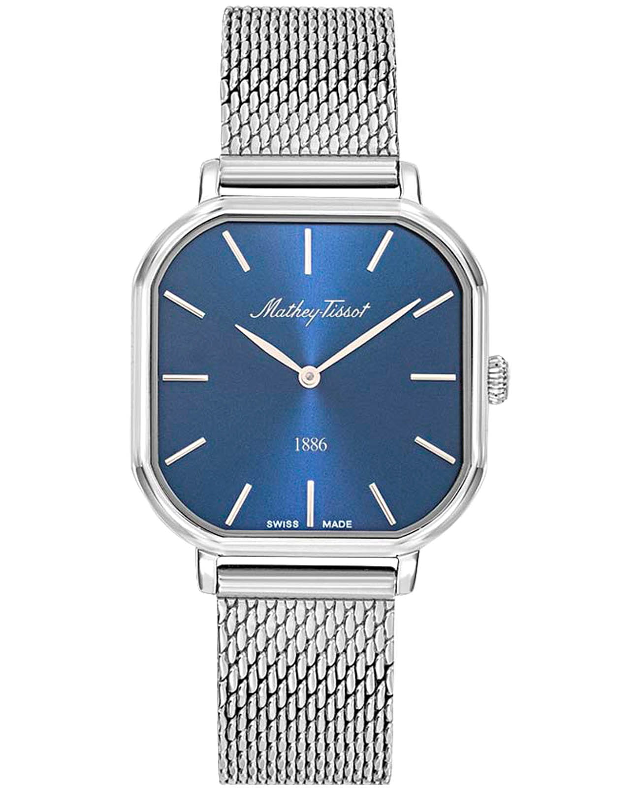 Женские кварцевые часы Mathey-Tissot Monsoon D7917ABU — это стильное сочетание элегантности и современного дизайна. Изящный корпус выполнен из нержавеющей стали серебристого цвета, размером 32х32 мм, что придаст образу элегантности и надежности. Изысканный циферблат с метками в виде штрихов придает модели особый блеск. Циферблат выполнен по технологии Sunray (солнечные лучи) и защищен минеральным стекломМинеральное стеклоМинеральное стекло представляет собой искусственно выращенный минерал кварца. Такое стекло отличается особой устойчивостью к повреждениям и царапинам. Уступает по некоторым качествам сапфировому стеклу. с сапфировым покрытием, обеспечивает устойчивость к царапинам. Часы оснащены надежным кварцевым механизмом. Стальной браслет миланского плетения на раскладном замкеРаскладная застёжкаТакой тип застёжки используется только на браслетах из металла. Она никогда не раскрывается полностью, происходит разделение на 2 и более частей. Раскладывающая застёжка снизит вероятность потери часов к минимуму., гарантирует комфортное и безопасное ношение. Класс водозащиты: 50 метров позволит защитить корпус от случайных брызг или капель дождя. Mathey-Tissot  — отличный выбор для тех, кто ценит утонченность и качество.