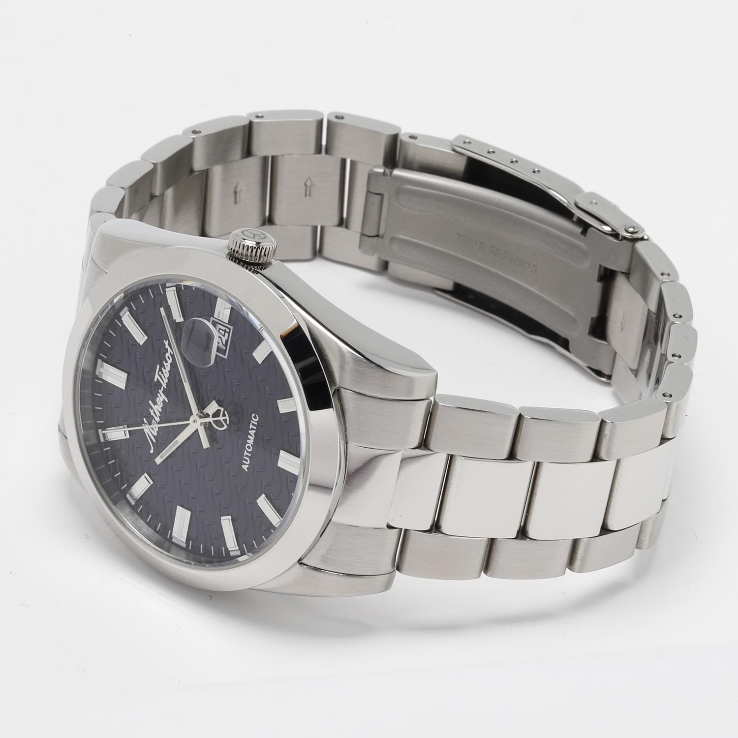 Мужские механические часы с автоподзаводом Mathey-Tissot Mathy H1450ATB — это стильное сочетание элегантности и современного дизайна. Изящный корпус выполнен из нержавеющей стали, диаметром 42 мм, что придаст образу элегантности и надежности. Изысканный циферблат с метками в виде штрихов придает модели особый блеск. Циферблат защищен минеральным стекломМинеральное стеклоМинеральное стекло представляет собой искусственно выращенный минерал кварца. Такое стекло отличается особой устойчивостью к повреждениям и царапинам. Уступает по некоторым качествам сапфировому стеклу. с сапфировым покрытием, обеспечивает устойчивость к царапинам. Стрелки и метки с люминесцентным покрытиемЛюминесцентное покрытиеПозволяет считывать показания времени в темноте. Производители наносят на стрелки, часовые индексы, безель или поверхность циферблата светонакопительный состав, дающий холодное свечение.. Окошко даты находится в положении 3 часа. Стальной браслет на раскладной застёжке с фиксаторомРаскладная застёжкаТакой тип застёжки используется только на браслетах из металла. Она никогда не раскрывается полностью, происходит разделение на 2 и более частей. Раскладывающая застёжка снизит вероятность потери часов к минимуму., гарантирует комфортное и безопасное ношение. Рифленая заводная головка. Класс водозащиты: 50 метров позволит защитить корпус от случайных брызг или капель дождя. Mathey-Tissot — отличный выбор для тех, кто ценит утонченность и качество.