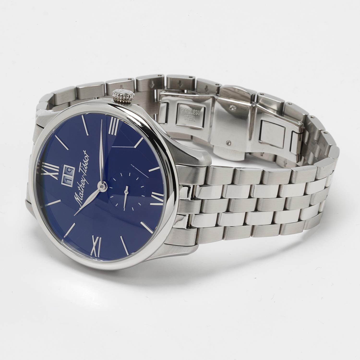 Мужские кварцевые часы Mathey-Tissot Edmond Metal H1886MABU — это стильное сочетание элегантности и современного дизайна. Изящный корпус выполнен из нержавеющей стали, диаметром 42 мм, что придаст образу элегантности и надежности. Изысканный циферблат с метками в виде штрихов и римских цифр придает модели особый блеск. Циферблат защищен минеральным стекломМинеральное стеклоМинеральное стекло представляет собой искусственно выращенный минерал кварца. Такое стекло отличается особой устойчивостью к повреждениям и царапинам. Уступает по некоторым качествам сапфировому стеклу. с сапфировым покрытием, обеспечивает устойчивость к царапинам. Окошко даты находится в положении 12 часов. Стальной браслет на застёжке-бабочке с кнопкамиЗастёжка "бабочка"Такой вид застёжки дополняется предохранителями, помогающими избежать случайного раскрытия браслета. Обладают изящным исполнением. , гарантирует комфортное и безопасное ношение. Секундная стрелка вынесена на отдельный циферблат. Рифленая заводная головка. Класс водозащиты: 50 метров позволит защитить корпус от случайных брызг или капель дождя. Mathey-Tissot — отличный выбор для тех, кто ценит утонченность и качество.