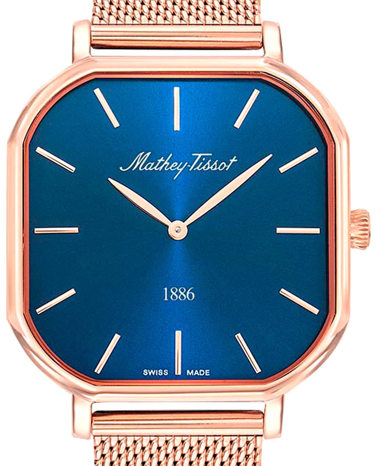 Мужские кварцевые часы Mathey-Tissot Monsoon H7917PBU — это стильное сочетание элегантности и современного дизайна. Изящный корпус выполнен из нержавеющей стали с PVD-покрытиемPVDУльтратонкое покрытие наносится в технике вакуумного напыления, сочетает в себе нитрид титана особой прочности со слоем золота или оксида хрома. Несёт в себе декоративную или защитную функцию. цвета розового золота, размером 40х40 мм, что придаст образу элегантности и надежности. Изысканный циферблат с метками в виде штрихов придает модели особый блеск. Циферблат выполнен по технологии Sunray (солнечные лучи) и защищен минеральным стекломМинеральное стеклоМинеральное стекло представляет собой искусственно выращенный минерал кварца. Такое стекло отличается особой устойчивостью к повреждениям и царапинам. Уступает по некоторым качествам сапфировому стеклу. с сапфировым покрытием, обеспечивает устойчивость к царапинам. Часы оснащены надежным кварцевым механизмом. Стальной браслет с PVD-покрытиемPVDУльтратонкое покрытие наносится в технике вакуумного напыления, сочетает в себе нитрид титана особой прочности со слоем золота или оксида хрома. Несёт в себе декоративную или защитную функцию. миланского плетения на раскладном замкеРаскладная застёжкаТакой тип застёжки используется только на браслетах из металла. Она никогда не раскрывается полностью, происходит разделение на 2 и более частей. Раскладывающая застёжка снизит вероятность потери часов к минимуму., гарантирует комфортное и безопасное ношение. Класс водозащиты: 50 метров позволит защитить корпус от случайных брызг или капель дождя. Mathey-Tissot — отличный выбор для тех, кто ценит утонченность и качество.