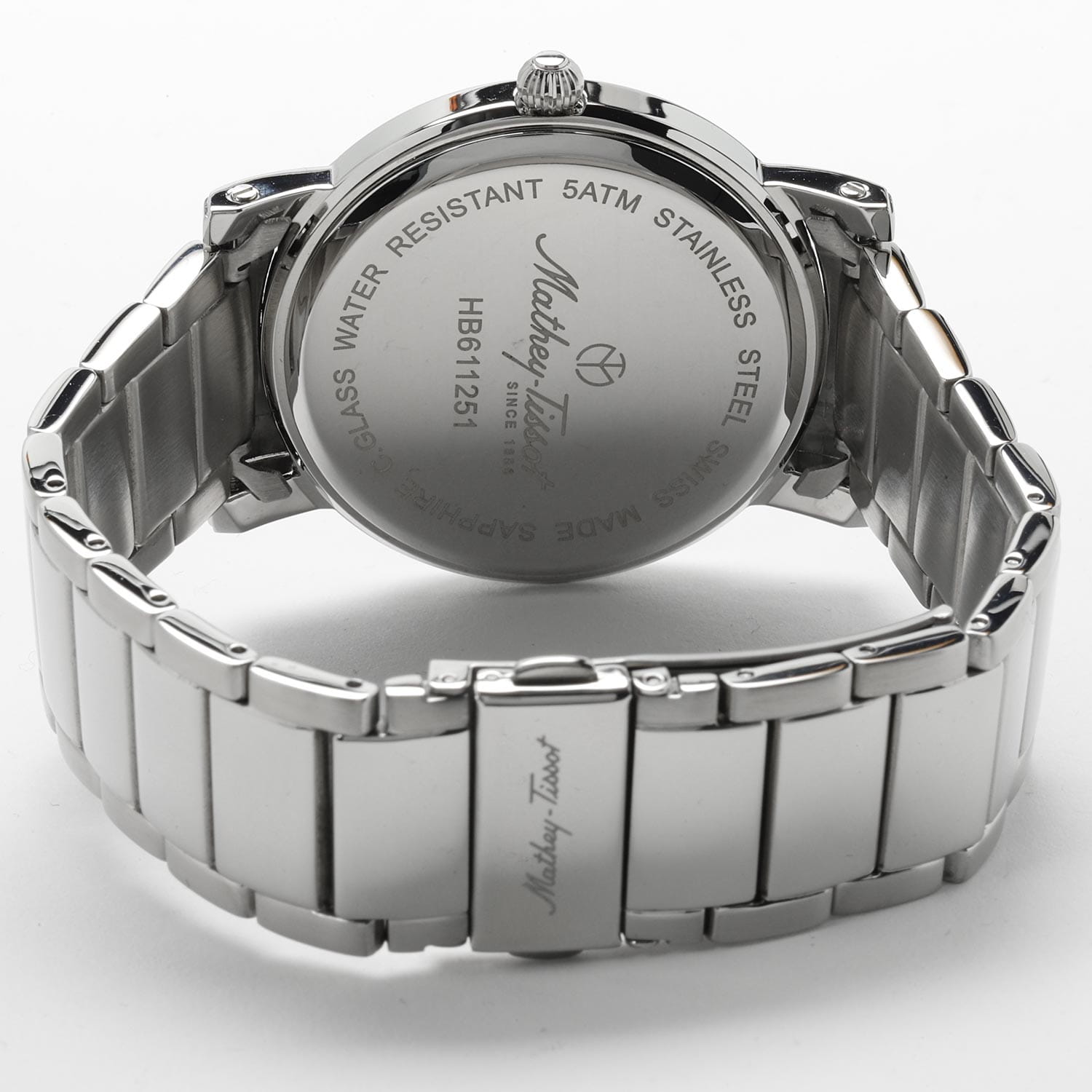 Мужские кварцевые часы Mathey-Tissot City Metal HB611251MABU — это стильное сочетание элегантности и современного дизайна. Изящный корпус выполнен из нержавеющей стали 316L серебристого цвета, диаметром 42 мм, что придаст образу элегантности и надежности. Изысканный циферблат с метками в виде штрихов придает модели особый блеск. Циферблат защищен минеральным стекломМинеральное стеклоМинеральное стекло представляет собой искусственно выращенный минерал кварца. Такое стекло отличается особой устойчивостью к повреждениям и царапинам. Уступает по некоторым качествам сапфировому стеклу. с сапфировым покрытием, обеспечивающий устойчивость к царапинам. Окошко даты находится в положении 3 часа. Часы оснащены надежным кварцевым механизмом. Стальной браслет на раскладной застёжкеРаскладная застёжкаТакой тип застёжки используется только на браслетах из металла. Она никогда не раскрывается полностью, происходит разделение на 2 и более частей. Раскладывающая застёжка снизит вероятность потери часов к минимуму., гарантирует комфортное и безопасное ношение. Класс водозащиты: 30 метров позволит защитить корпус от случайных брызг или капель дождя. Mathey-Tissot  — отличный выбор для тех, кто ценит утонченность и качество.