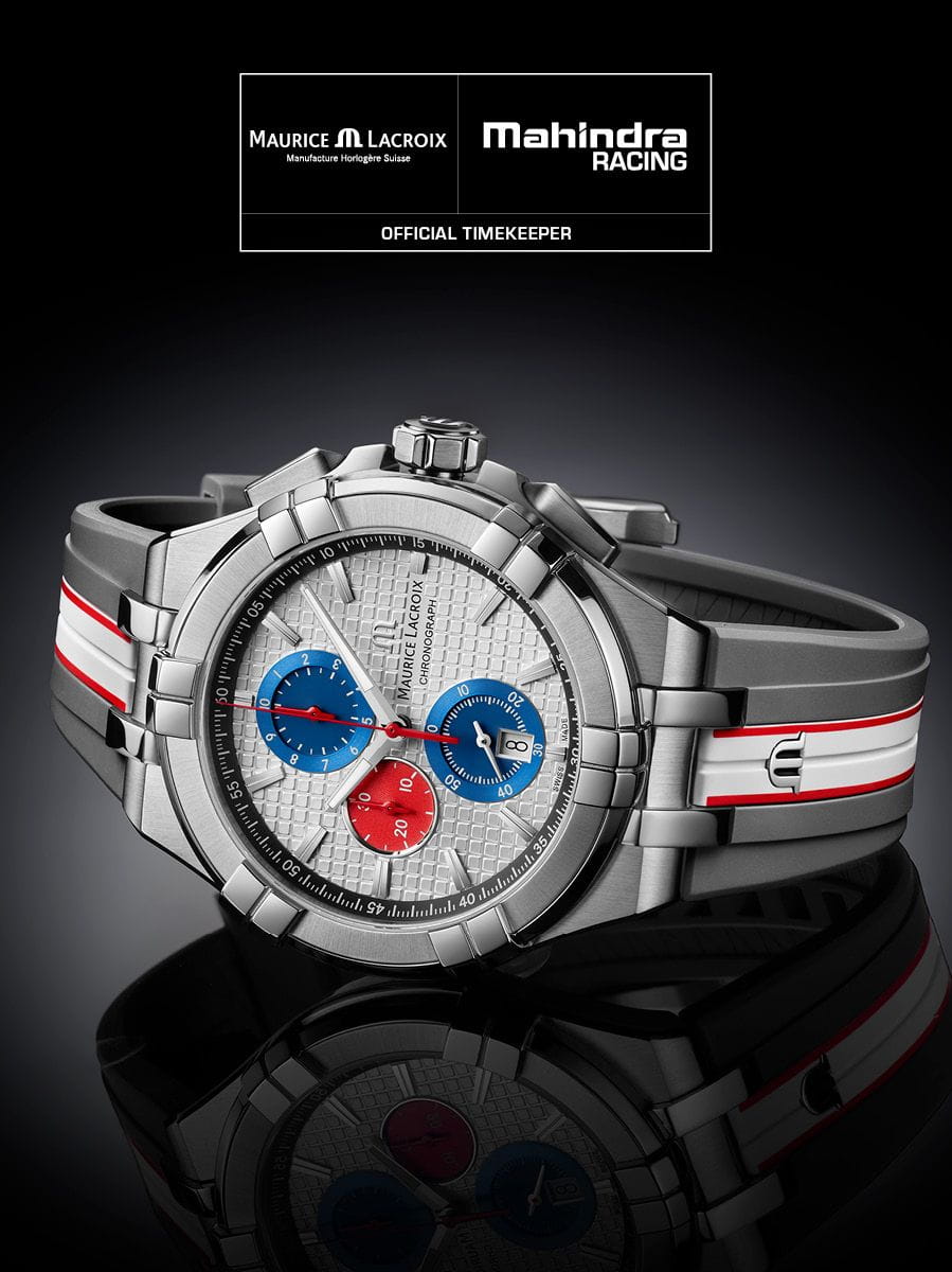 Синие, красные и серые цвета являются отсылкой к окраске автомобиля Mahindra гонки Formula E. Модель дополнена цветным ремешком в гоночной стилистике, а на задней крышке часов можно увидеть гравировку в виде гоночной формы команды Mahindra. Этот хронограф станет идеальным инструментом для обитателей пит-лейнов.