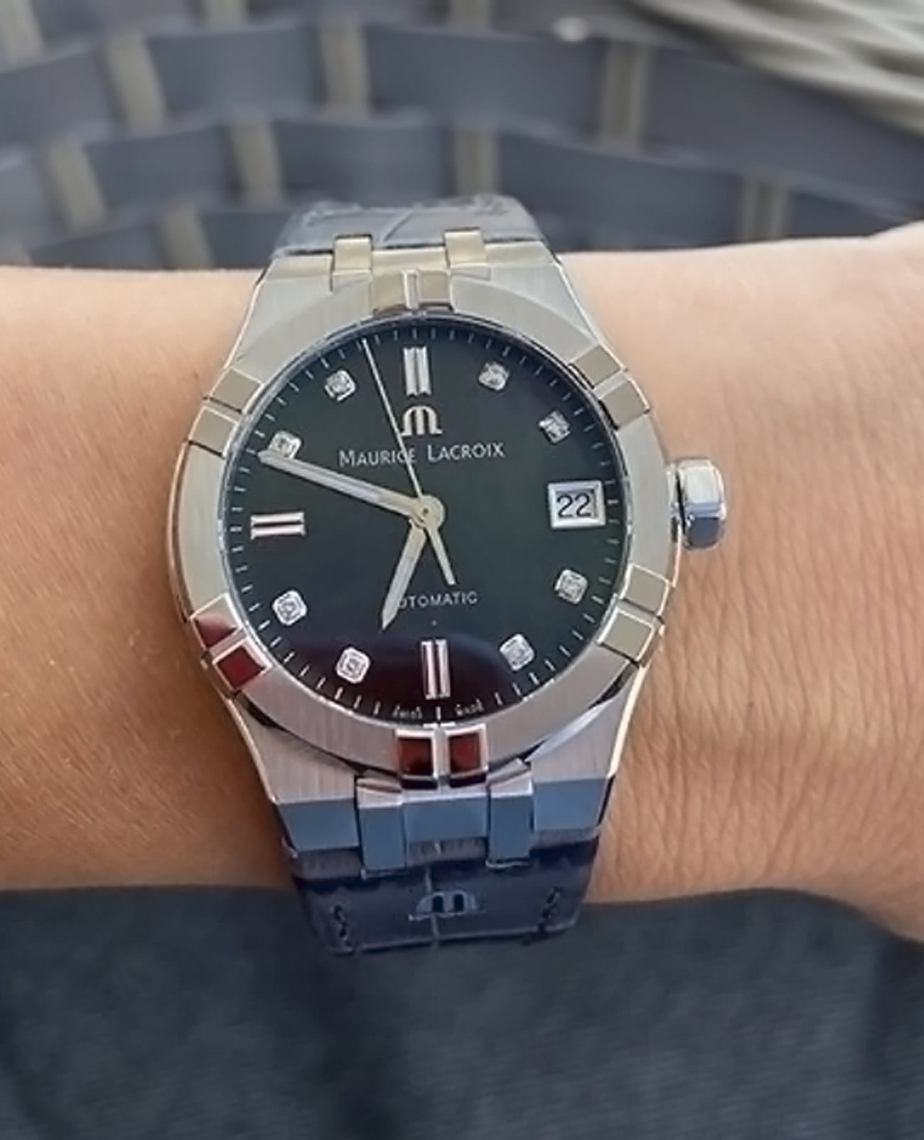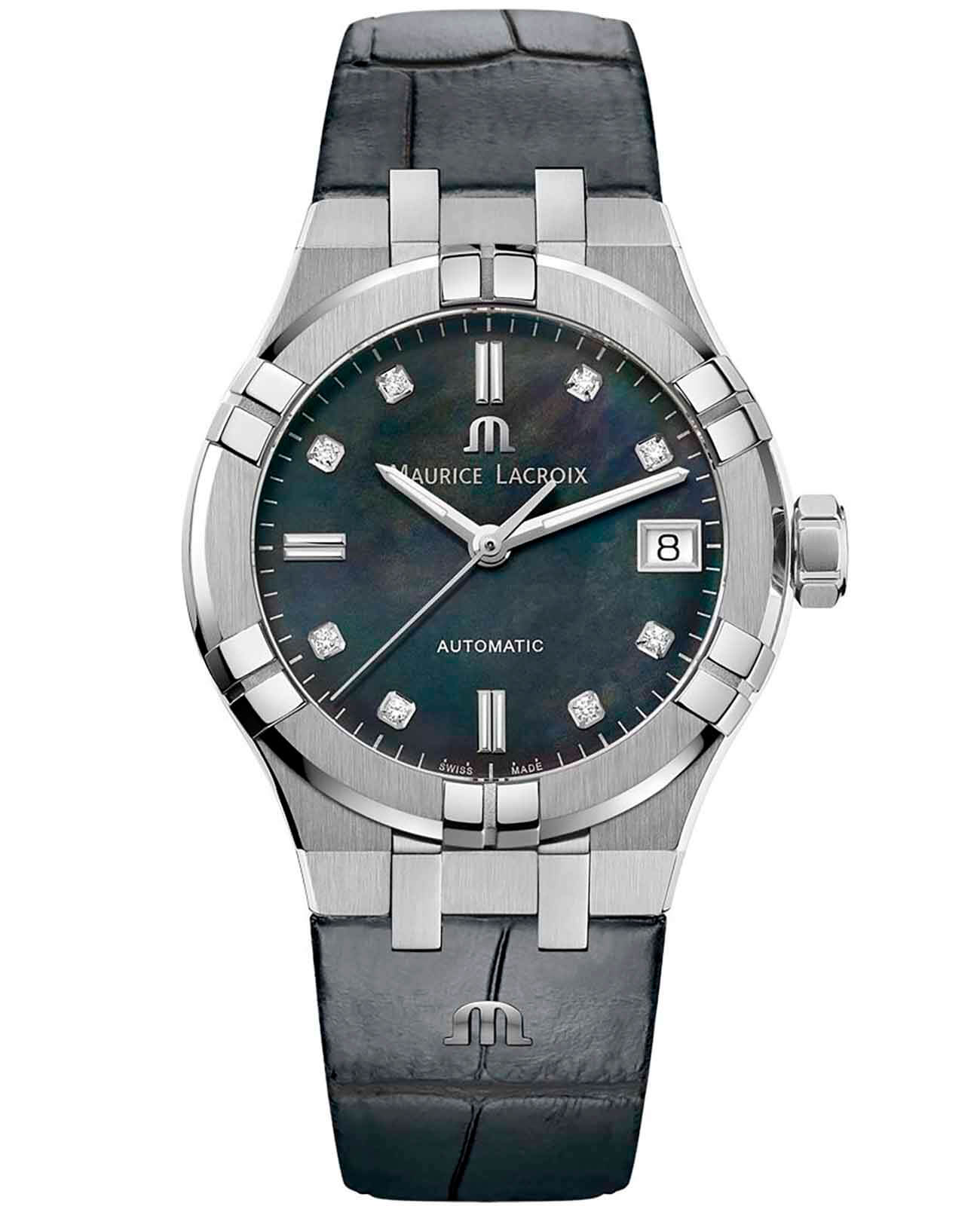 Женские швейцарские механические часы с автоподзаводом Maurice Lacroix Aikon Automatic AI6006-SS001-370-1, механический механизм (автоматический калибр) с высокой точностью. Сапфировое стеклоСапфировое стеклоПрочный и надёжный материал из кристалла сапфира синтетического происхождения, характеризующийся особой твёрдостью и устойчивостью к царапинам и повреждениям. устойчивое к появлению царапин, обладающее высокой прозрачностью. Корпус часов изготовлен из нержавеющей стали. Циферблат украшают бриллианты. Окошко даты в положении 3 часов. Стрелки с люминесцентным покрытиемЛюминесцентное покрытиеПозволяет считывать показания времени в темноте. Производители наносят на стрелки, часовые индексы, безель или поверхность циферблата светонакопительный состав, дающий холодное свечение.. Класс водозащиты: 200 метров, позволит плавать, нырять и заниматься другими водными видами спорта. Кожаный ремешок на застёжке-бабочке с кнопкамиЗастёжка "бабочка"Такой вид застёжки дополняется предохранителями, помогающими избежать случайного раскрытия браслета. Обладают изящным исполнением. .