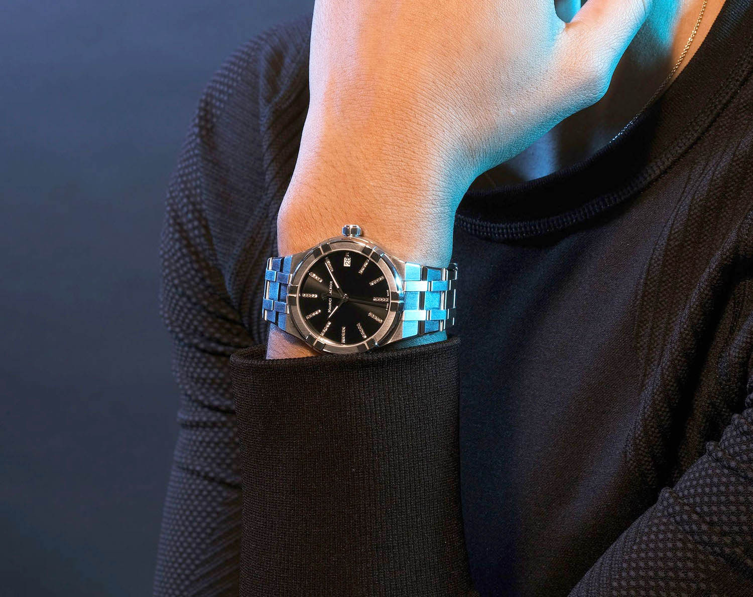 Женские швейцарские кварцевые часы Maurice Lacroix Aikon Quartz AI1106-PVP02-170-1. Сапфировое стеклоСапфировое стеклоПрочный и надёжный материал из кристалла сапфира синтетического происхождения, характеризующийся особой твёрдостью и устойчивостью к царапинам и повреждениям. устойчивое к появлению царапин, обладающее высокой прозрачностью. Черный циферблат. Стрелки с люминесцентным покрытиемЛюминесцентное покрытиеПозволяет считывать показания времени в темноте. Производители наносят на стрелки, часовые индексы, безель или поверхность циферблата светонакопительный состав, дающий холодное свечение.. Метки на циферблате украшены бриллиантами. Класс водозащиты: 100 метров, позволит плавать, нырять и заниматься другими водными видами спорта. Окошко даты находится в положении 3 часов. Корпус и браслет часов изготовлены из стали с частичным. Браслет с застёжкой «бабочка» с кнопкамиЗастёжка "бабочка"Такой вид застёжки дополняется предохранителями, помогающими избежать случайного раскрытия браслета. Обладают изящным исполнением. .