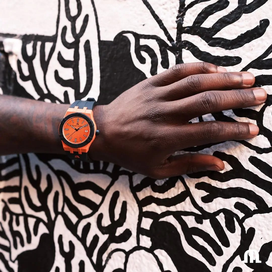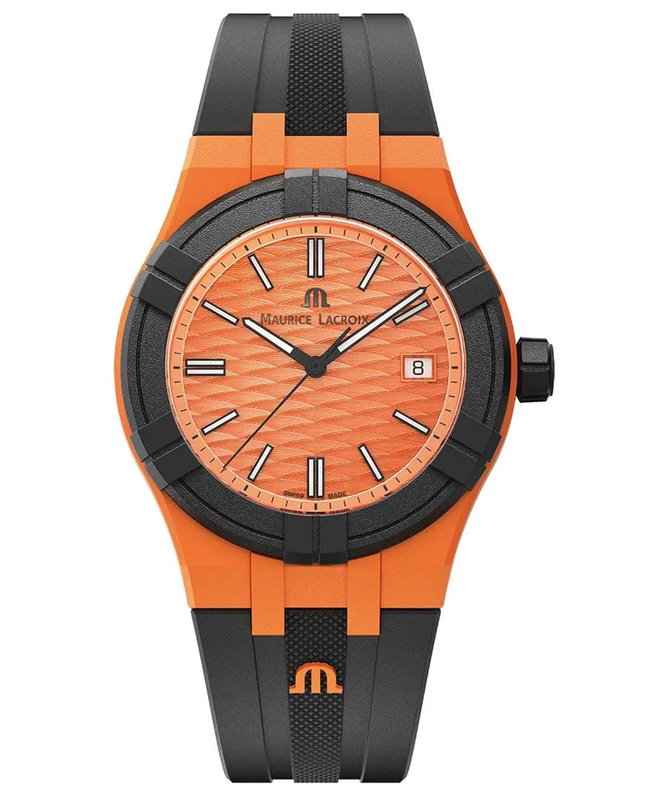 Мужские швейцарские кварцевые часы Maurice Lacroix Aikon Quartz AI2008-50050-300-0. Сапфировое стеклоСапфировое стеклоПрочный и надёжный материал из кристалла сапфира синтетического происхождения, характеризующийся особой твёрдостью и устойчивостью к царапинам и повреждениям. устойчивое к появлению царапин, обладающее высокой прозрачностью. Оранжевый циферблат. Стрелки и метки с люминесцентным покрытиемЛюминесцентное покрытиеПозволяет считывать показания времени в темноте. Производители наносят на стрелки, часовые индексы, безель или поверхность циферблата светонакопительный состав, дающий холодное свечение.. Класс водозащиты: 100 метров, позволит плавать, нырять и заниматься другими водными видами спорта. Окошко даты находится в положении 3 часов. Циферблат с тематическим гильошированием "Vagues du Jura". Корпус выполнен из переработанного пластика, ранее загрязнявшего Мировой океан. Каучуковый ремешок с классической застежкой.