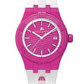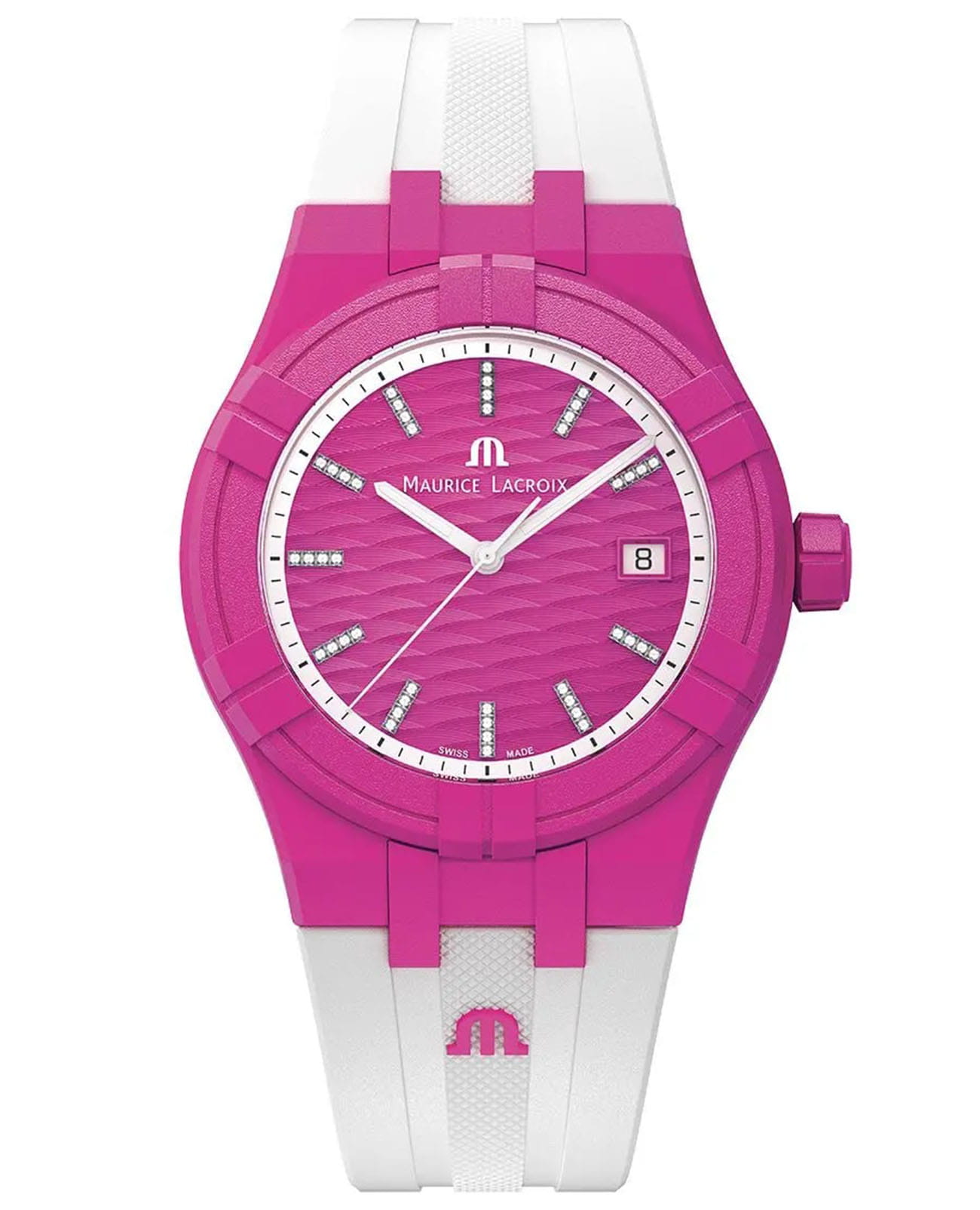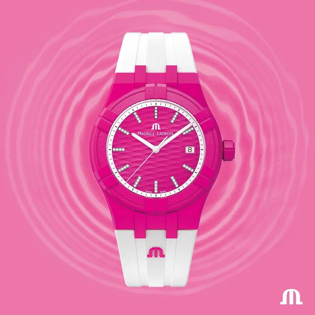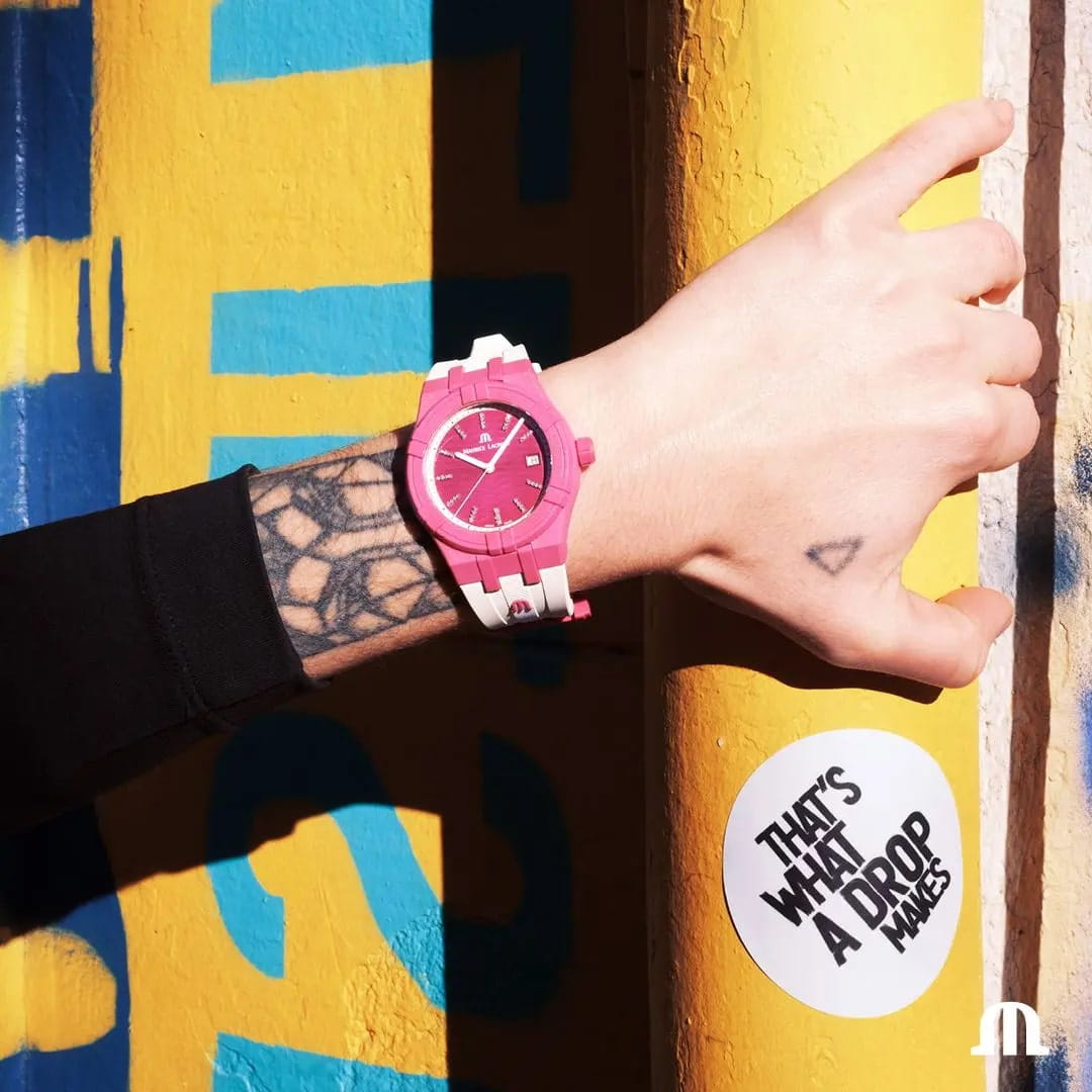 Часы AIKON #tide обладают всеми преимуществами AIKON, но кроме того, они выполнены из особого материала под названием #tideocean – переработанного океанского пластика, усиленного стекловолокном. В результате сложного технологического процесса переработки получен композитный материал, вдвое превосходящий по прочности обычный пластик. Износостойкость композита #tideocean в пять раз выше полиэтилентерефталата (ПЭТ). И еще немаловажный экологический фактор – в процессе превращения океанского пластика в материал #tideocean углеродные выбросы в атмосферу значительно снижаются, чем при обычном процессе выпуска первичного пластика. В новой модели безельБезельВнешний ободок, закрепляющий стекло. В спортивных часах так называется поворотное кольцо с делениями на циферблате, выполняет роль таймера – замеряет отрезки времени на шкале. Неподвижный безель – элемент декора. Однонаправленно вращающийся безель на дайверских часах позволяет фиксировать моменты погружения и выныривания на поверхность., корпус, задняя крышка, заводная головка, наконечник и застежка выполнены из композитного материала #tideocean. 17 пластиковых бутылок требуется для производства одних отличных часов и их специальной упаковки, также на 100% состоящей из материала #tide, появившегося в результате отходов пластика в океане. В результате такой переработки выигрывают все. Унисекс швейцарские кварцевые часы Maurice Lacroix Aikon Quartz AI2008-FFFF1-3A0-0. Сапфировое стеклоСапфировое стеклоПрочный и надёжный материал из кристалла сапфира синтетического происхождения, характеризующийся особой твёрдостью и устойчивостью к царапинам и повреждениям. устойчивое к появлению царапин, обладающее высокой прозрачностью. Темно-розовый циферблат. Стрелки и метки с люминесцентным покрытиемЛюминесцентное покрытиеПозволяет считывать показания времени в темноте. Производители наносят на стрелки, часовые индексы, безель или поверхность циферблата светонакопительный состав, дающий холодное свечение.. Класс водозащиты: 100 метров, позволит плавать, нырять и заниматься другими водными видами спорта. Окошко даты находится в положении 3 часов. Циферблат с тематическим гильошированием "Vagues du Jura". Корпус выполнен из переработанного пластика, ранее загрязнявшего Мировой океан. Каучуковый ремешок с классической застежкой.