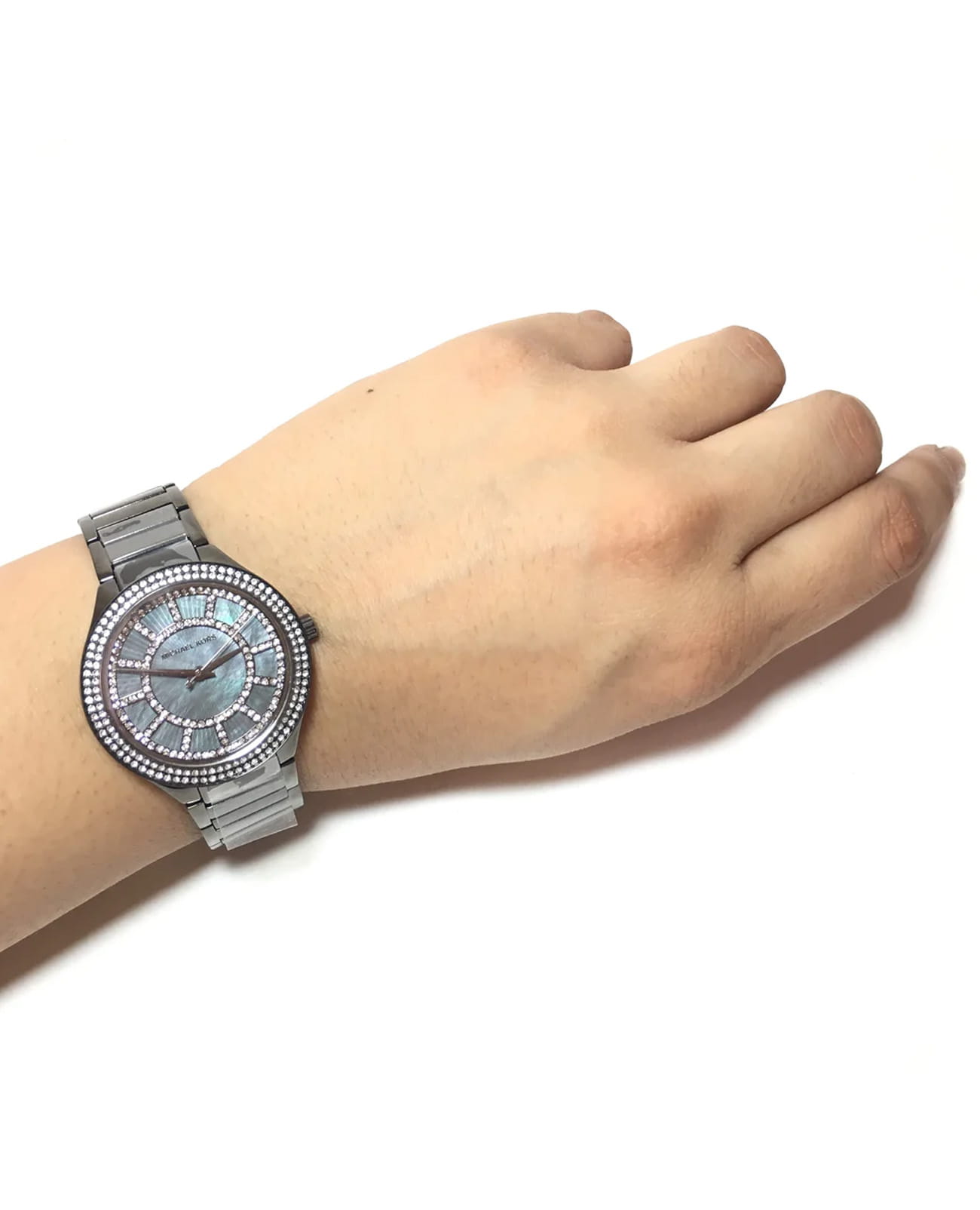 Женские американские часы Michael Kors Kerry MK3410, кварцевый механизм с высокой точностью. Минеральное стеклоМинеральное стеклоМинеральное стекло представляет собой искусственно выращенный минерал кварца. Такое стекло отличается особой устойчивостью к повреждениям и царапинам. Уступает по некоторым качествам сапфировому стеклу., устойчивое к мелким механическим повреждениям. Корпус часов выполнен из нержавеющей стали с PVD-покрытиемPVDУльтратонкое покрытие наносится в технике вакуумного напыления, сочетает в себе нитрид титана особой прочности со слоем золота или оксида хрома. Несёт в себе декоративную или защитную функцию.. БезельБезельВнешний ободок, закрепляющий стекло. В спортивных часах так называется поворотное кольцо с делениями на циферблате, выполняет роль таймера – замеряет отрезки времени на шкале. Неподвижный безель – элемент декора. Однонаправленно вращающийся безель на дайверских часах позволяет фиксировать моменты погружения и выныривания на поверхность. и циферблат украшены кристаллами. Класс водозащиты: 50 метров, позволит защитить корпус от случайных брызг или капель дождя. Стальной браслет с PVD-покрытиемPVDУльтратонкое покрытие наносится в технике вакуумного напыления, сочетает в себе нитрид титана особой прочности со слоем золота или оксида хрома. Несёт в себе декоративную или защитную функцию. на раскладной застёжкеРаскладная застёжкаТакой тип застёжки используется только на браслетах из металла. Она никогда не раскрывается полностью, происходит разделение на 2 и более частей. Раскладывающая застёжка снизит вероятность потери часов к минимуму..