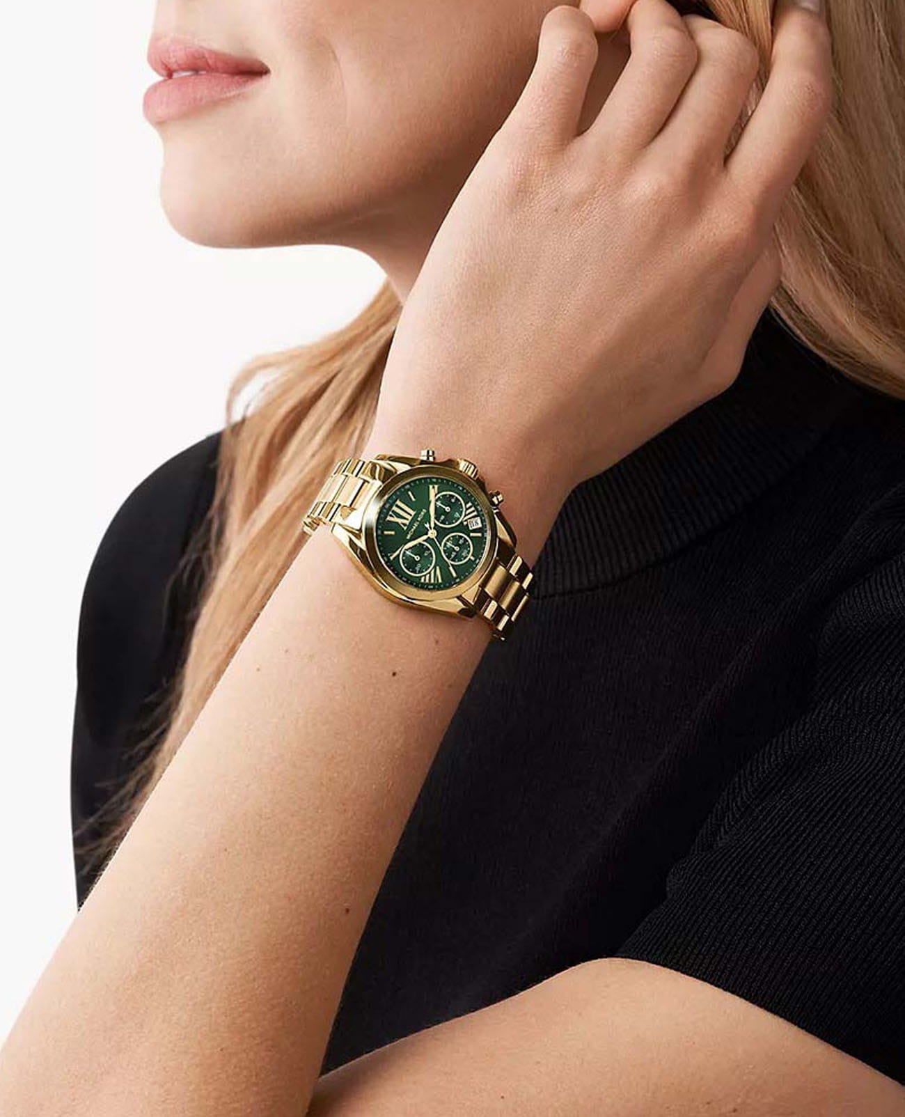Женские американские часы-хронографХронографФункция позволяет измерять отрезки времени с особой точностью: часы, минуты, секунды. Верным признаком хронографа является наличие на циферблате 3 дополнительных окошек-счётчиков. с секундомеромСекундомерСекундоме́р — прибор, способный измерять интервалы времени с точностью до долей секунды. и с минеральным стекломМинеральное стеклоМинеральное стекло представляет собой искусственно выращенный минерал кварца. Такое стекло отличается особой устойчивостью к повреждениям и царапинам. Уступает по некоторым качествам сапфировому стеклу. Michael Kors Bradshaw MK7257, кварцевый механизм с высокой точностью. Корпус часов изготовлен из стали с PVD-покрытиемPVDУльтратонкое покрытие наносится в технике вакуумного напыления, сочетает в себе нитрид титана особой прочности со слоем золота или оксида хрома. Несёт в себе декоративную или защитную функцию.. Циферблат выполнен по технологии Sunray (солнечные лучи). Три дополнительных индикатора. Метки в виде штрихов и римских цифр. Окошко даты находится между 4 и 5 часами. Заводная головка с защитой. Класс водозащиты: 100 метров, позволит плавать, нырять и заниматься другими водными видами спорта. Стальной браслет с PVD-покрытиемPVDУльтратонкое покрытие наносится в технике вакуумного напыления, сочетает в себе нитрид титана особой прочности со слоем золота или оксида хрома. Несёт в себе декоративную или защитную функцию. на раскладной застёжкеРаскладная застёжкаТакой тип застёжки используется только на браслетах из металла. Она никогда не раскрывается полностью, происходит разделение на 2 и более частей. Раскладывающая застёжка снизит вероятность потери часов к минимуму..