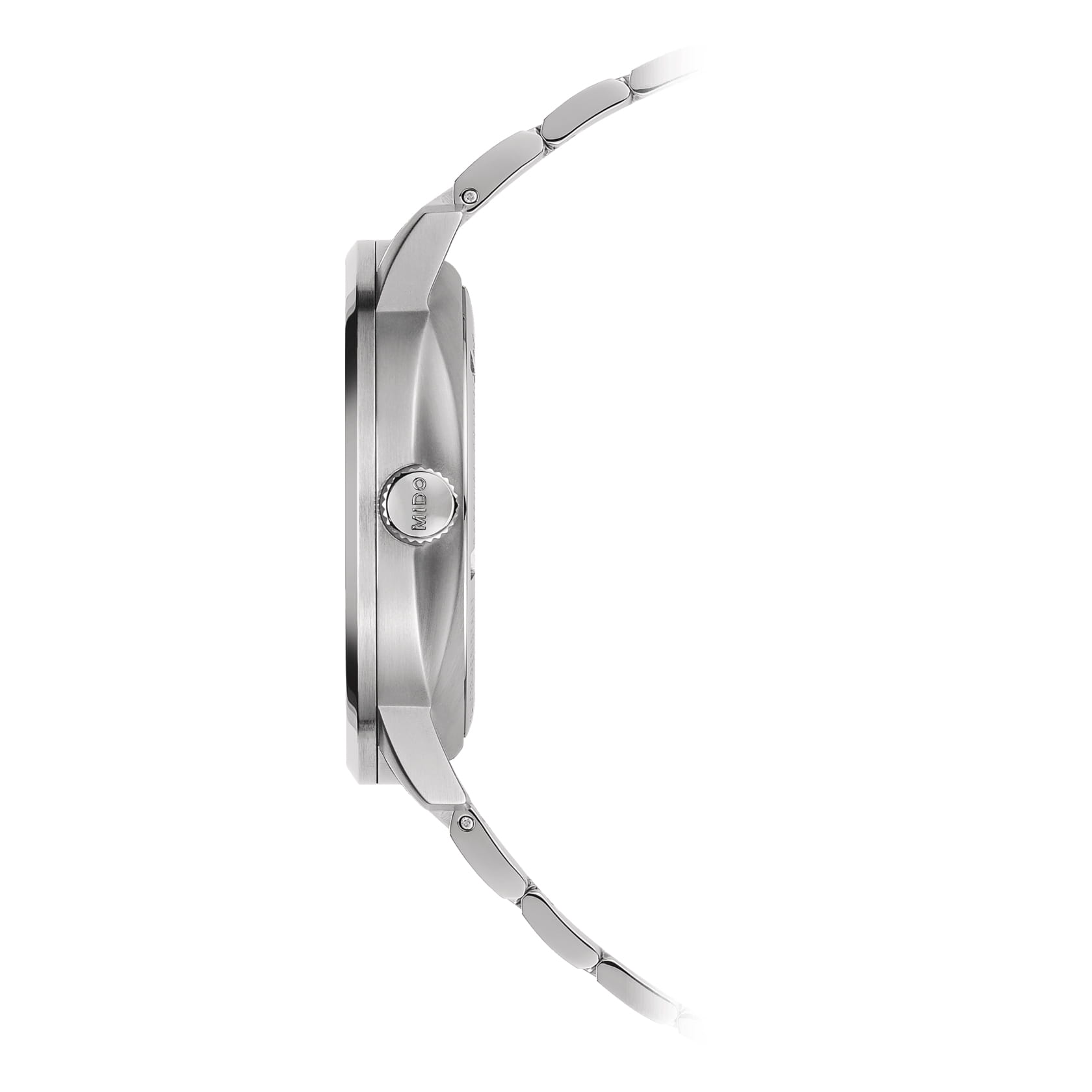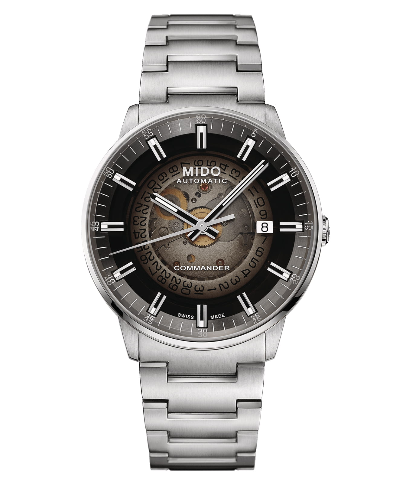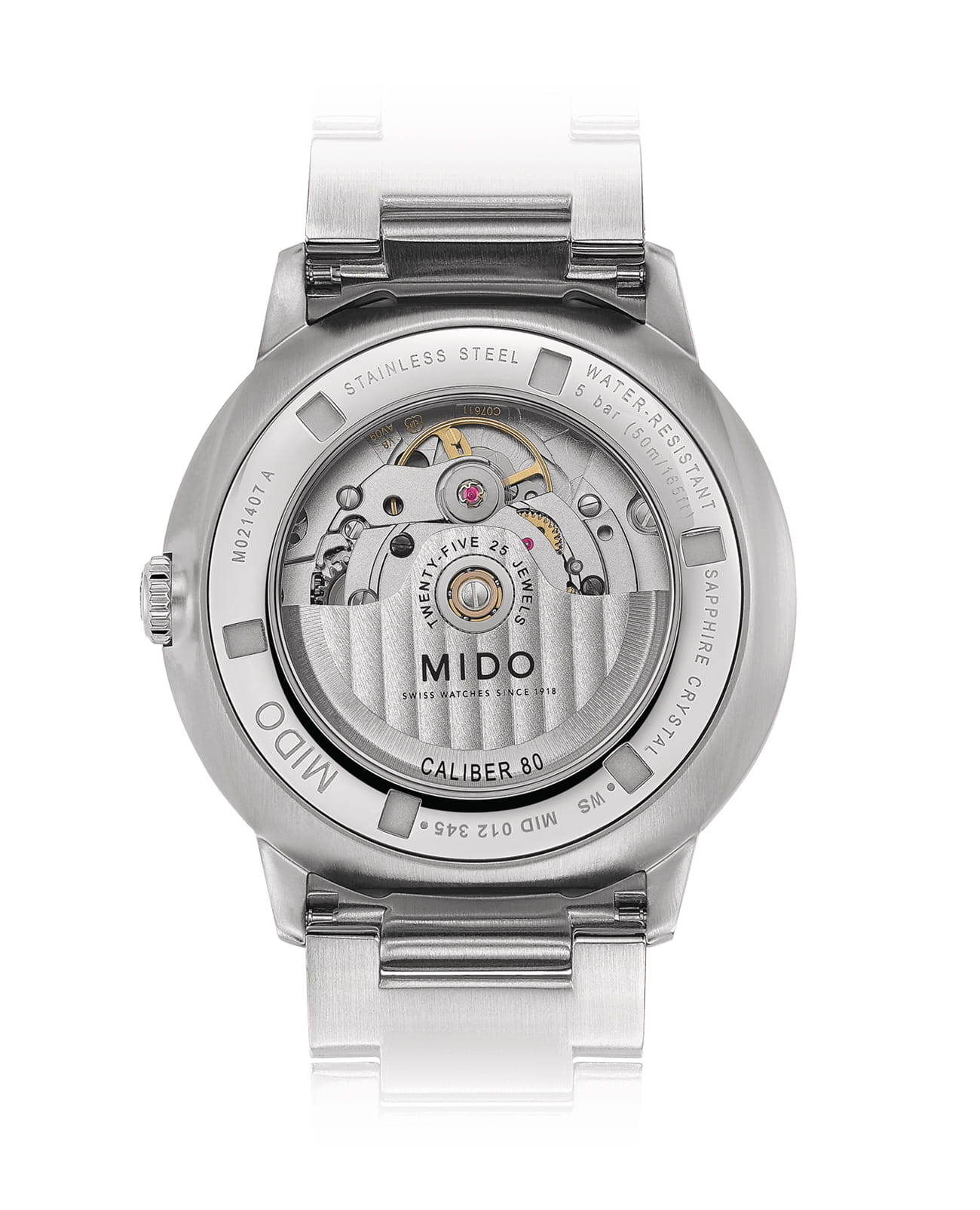Модель оснащена автоматическим механизмом MIDO на базе ETA, обеспечивающим запас хода до 80 часов. Функционал включает индикацию часов, минут, секунд и даты, расположенной в положении «3 часа».