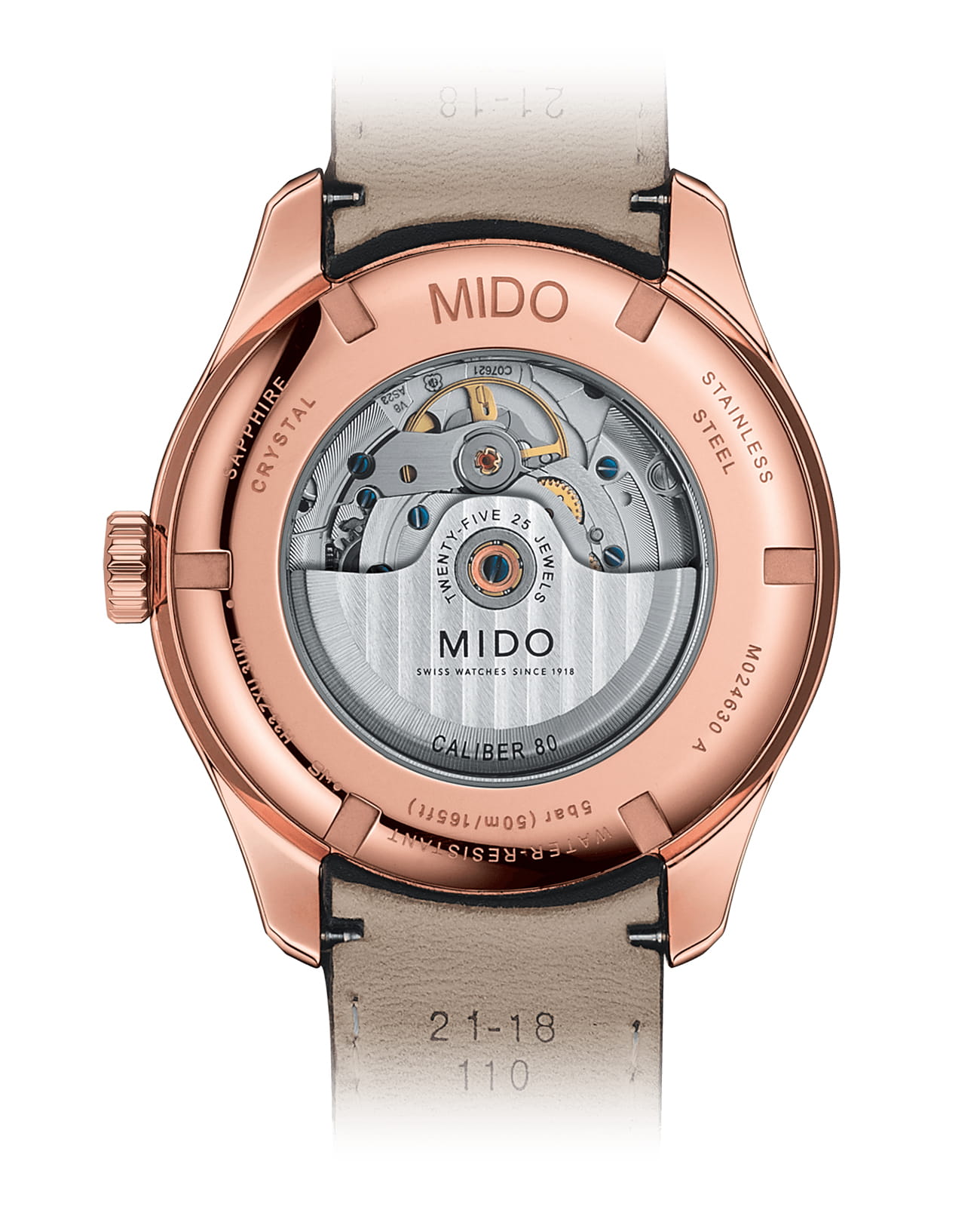 Модель оснащена автоматическим механизмом MIDO Caliber 80 (на базе ETA C07.621), обеспечивающим запас хода до 80 часов. Функционал включает индикацию часов, минут, секунд, дня недели и даты, расположенных в положении «3 часа».