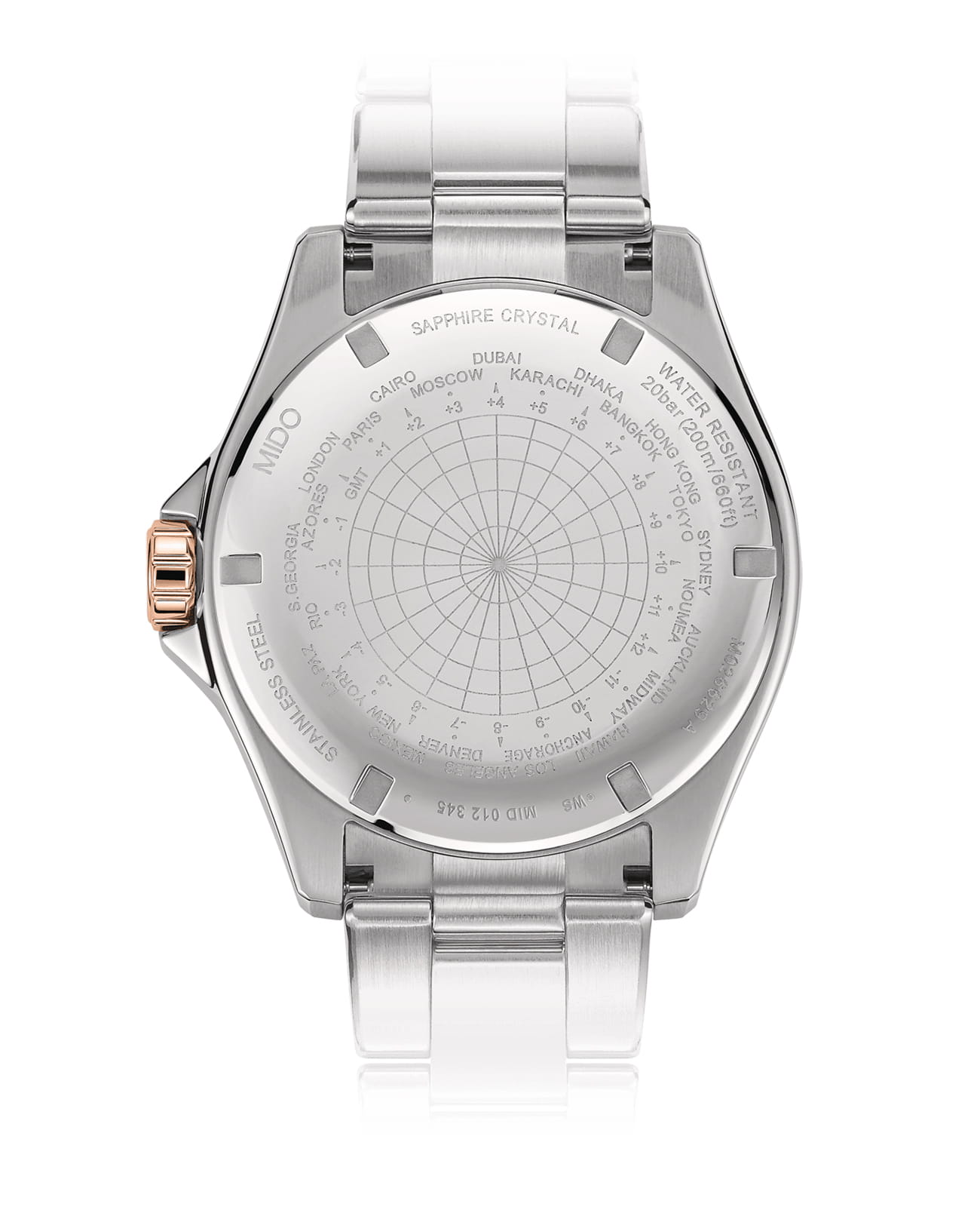 Часы MIDO Ocean Star GMT (артикул M026.629.22.051.00) сочетают элегантность и функциональность, идеально подходя для путешественников и любителей водных видов спорта. Корпус диаметром 44 мм выполнен из нержавеющей стали с PVD-покрытиемPVDУльтратонкое покрытие наносится в технике вакуумного напыления, сочетает в себе нитрид титана особой прочности со слоем золота или оксида хрома. Несёт в себе декоративную или защитную функцию. розового золота и керамическим безелем. Водозащита до 20 бар (200 метров) и завинчивающаяся заводная головка обеспечивают надёжность. Чёрный циферблат с накладными часовыми метками, покрытыми Super-LumiNova®Люминесцентное покрытиеПозволяет считывать показания времени в темноте. Производители наносят на стрелки, часовые индексы, безель или поверхность циферблата светонакопительный состав, дающий холодное свечение., защищён сапфировым стекломСапфировое стеклоПрочный и надёжный материал из кристалла сапфира синтетического происхождения, характеризующийся особой твёрдостью и устойчивостью к царапинам и повреждениям. с двусторонним антибликовым покрытием.