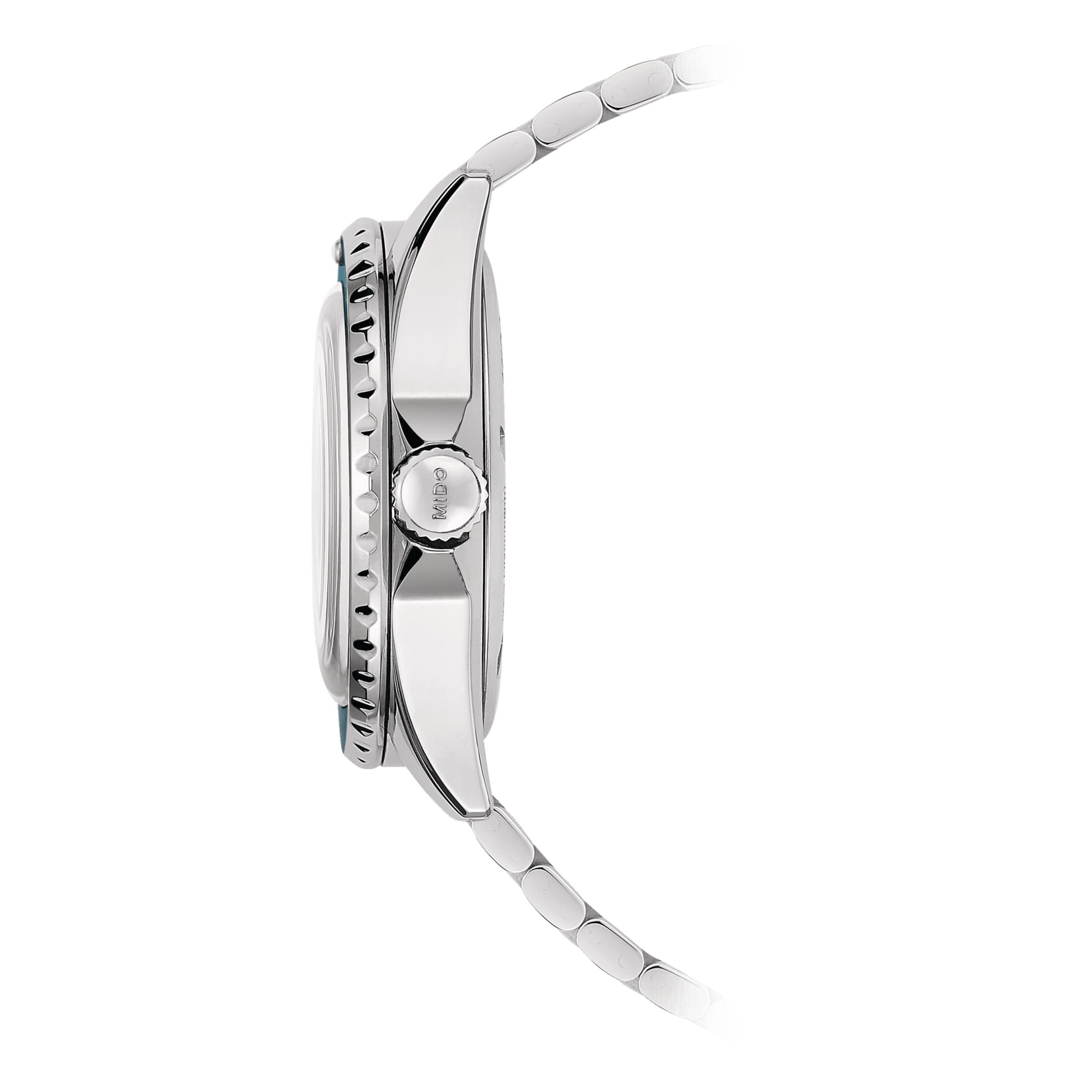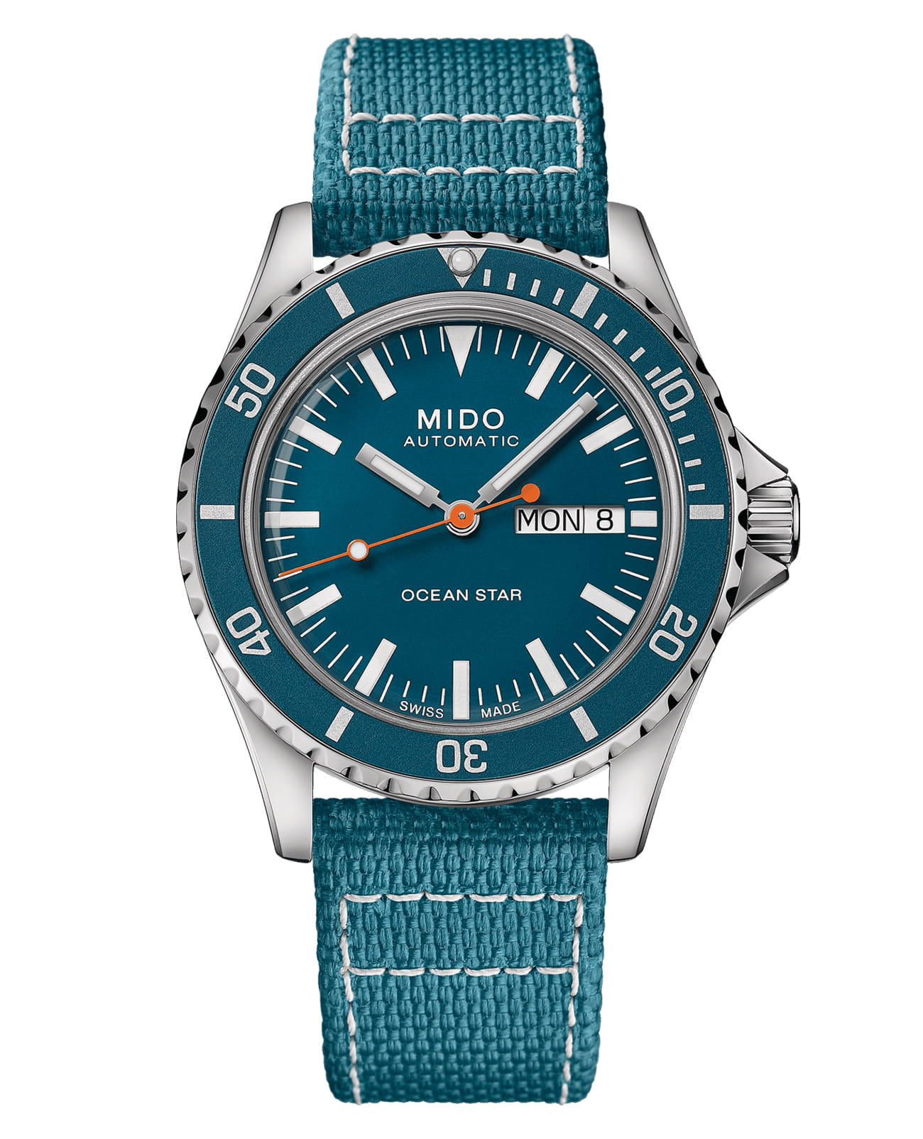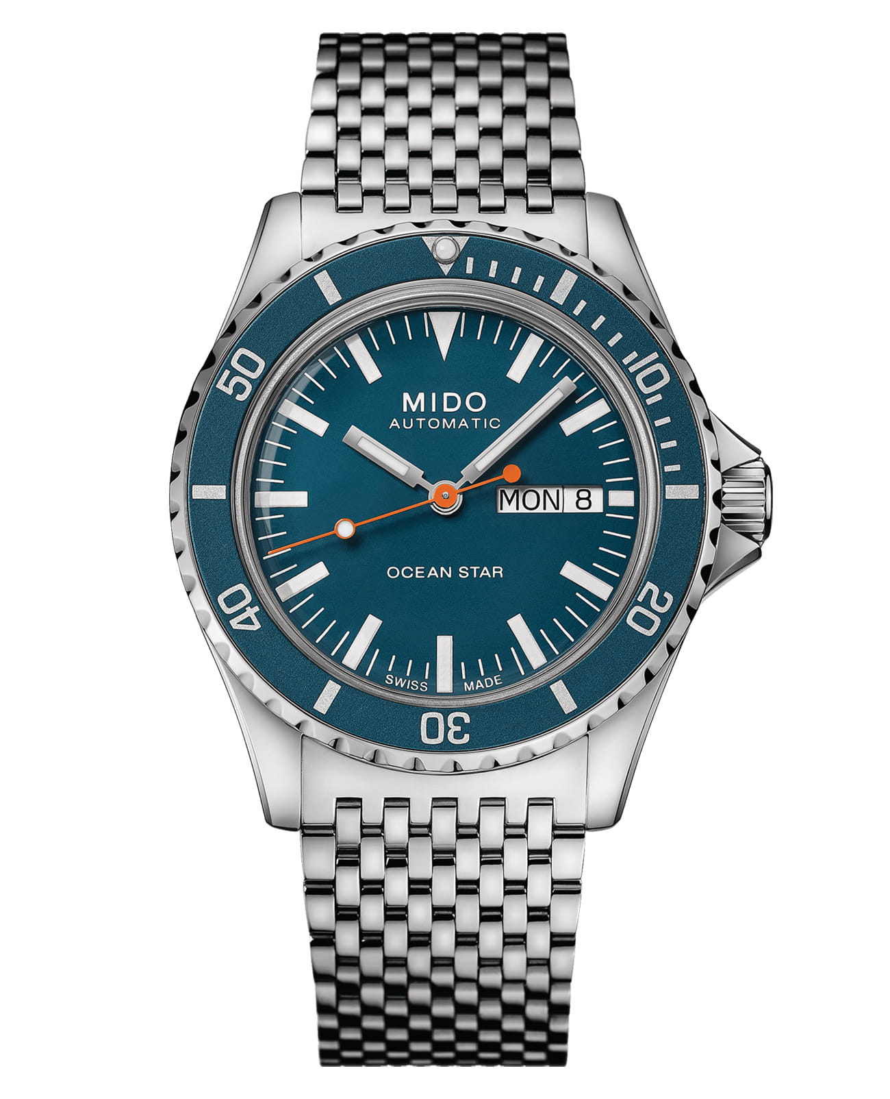 Часы MIDO Ocean Star Tribute (артикул M026.830.11.041.00) — это современная интерпретация дайверских моделей 1960-х годов, сочетающая винтажный дизайн с передовыми технологиями. Корпус диаметром 40,5 мм выполнен из нержавеющей стали с водозащитой до 20 бар (200 метров). Вращающийся безель и накладные часовые метки, покрытые Super-LumiNova®Люминесцентное покрытиеПозволяет считывать показания времени в темноте. Производители наносят на стрелки, часовые индексы, безель или поверхность циферблата светонакопительный состав, дающий холодное свечение., обеспечивают удобство и надёжность. Синий циферблат защищён сапфировым стекломСапфировое стеклоПрочный и надёжный материал из кристалла сапфира синтетического происхождения, характеризующийся особой твёрдостью и устойчивостью к царапинам и повреждениям..