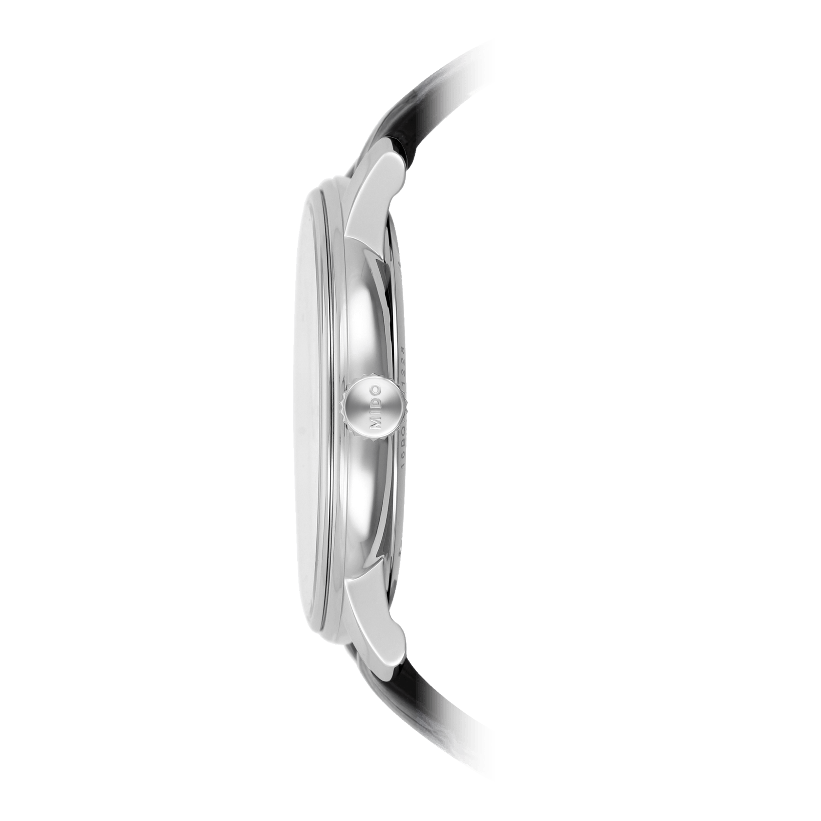 Часы Mido Baroncelli Heritage Gent M027.407.16.010.00 — это элегантный мужской аксессуар, который сочетает классический дизайн и современные технологии. Корпус диаметром 39 мм выполнен из нержавеющей стали, что обеспечивает долговечность и утончённый внешний вид. Белый циферблат с серебристыми стрелками и индексами защищён сапфировым стекломСапфировое стеклоПрочный и надёжный материал из кристалла сапфира синтетического происхождения, характеризующийся особой твёрдостью и устойчивостью к царапинам и повреждениям. с двойным антибликовым покрытиемАнтибликовое покрытиеСлой оксида металла в 0,13-0,3 микрон, благодаря которому стекло часов не бликует и не отражает свет. Антибликовое покрытие уменьшает отражение света в 10 раз, обеспечивая отличную читаемость показателей циферблата., устойчивым к царапинам.