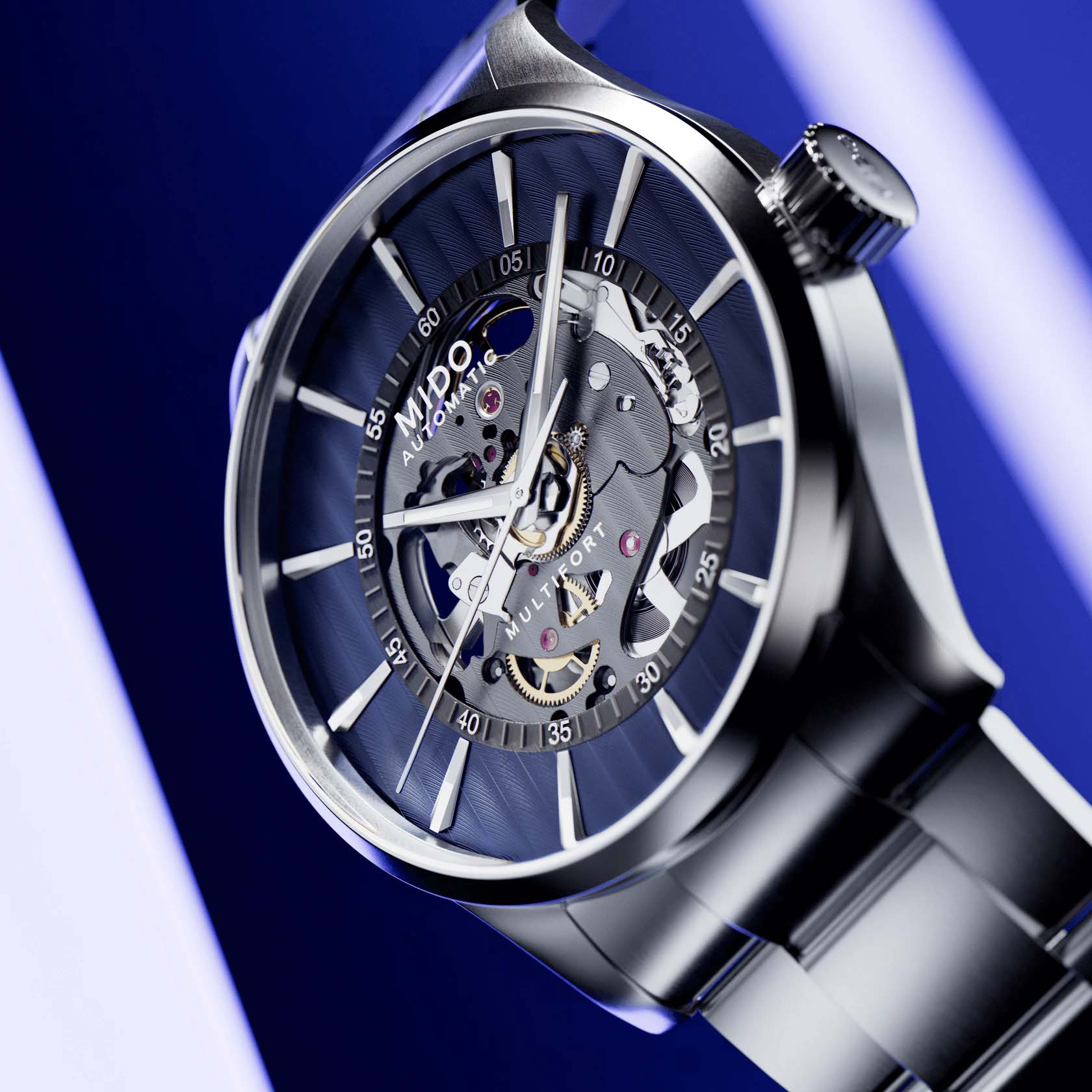 Мужские швейцарские механические часы с хронометром Mido Multifort Skeleton Vertigo M038.436.11.041.00, механический механизм (автоматический калибр) с высокой точностью. Сапфировое стеклоСапфировое стеклоПрочный и надёжный материал из кристалла сапфира синтетического происхождения, характеризующийся особой твёрдостью и устойчивостью к царапинам и повреждениям. устойчивое к появлению царапин, обладающее высокой прозрачностью. Класс водозащиты: 100 метров, позволит плавать, нырять и заниматься другими водными видами спорта. Корпус часов изготовлен из нержавеющей стали.