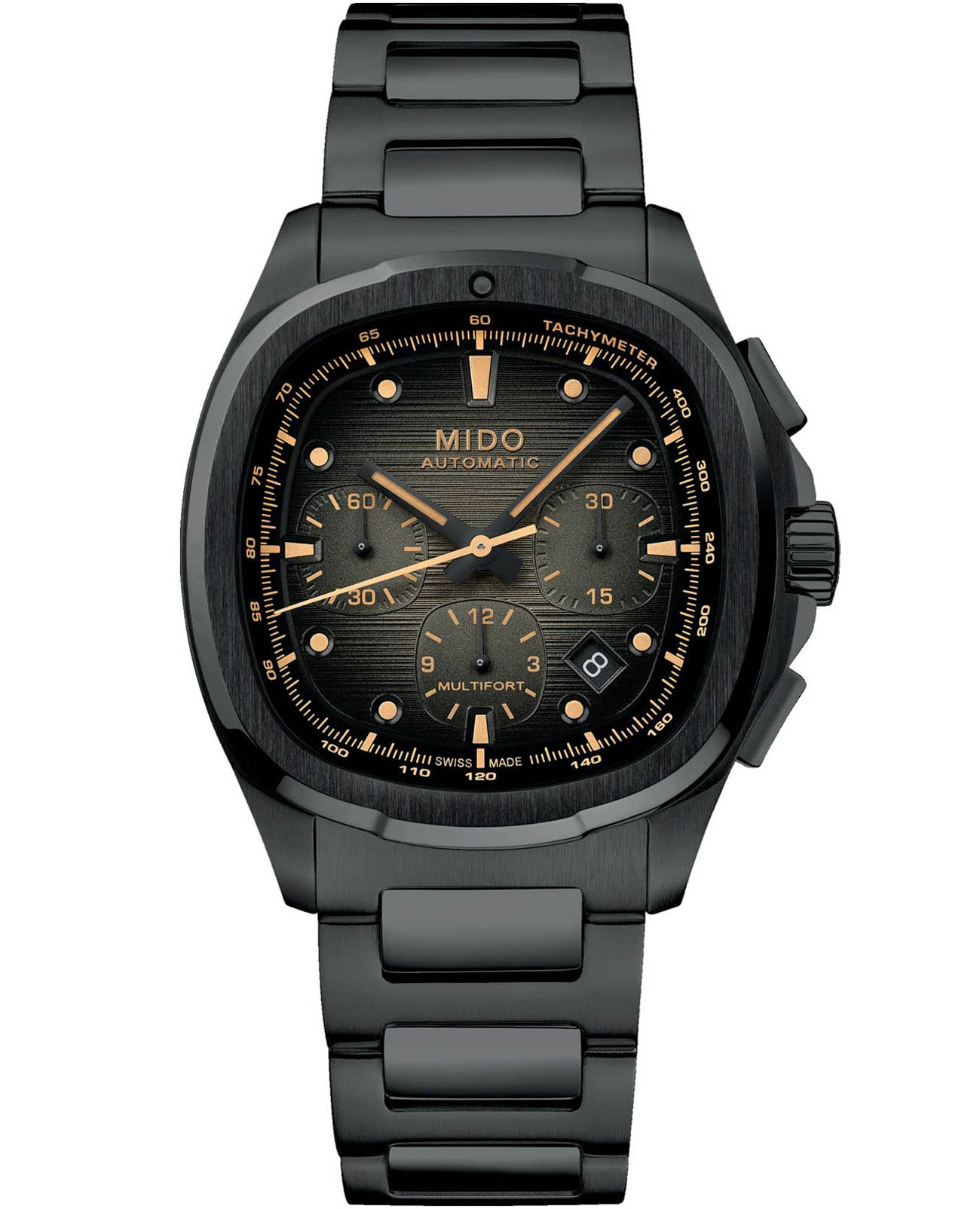Мужские механические швейцарские часы Mido Multifort TV Chronograph M049.527.33.081.00, механический механизм с высокой точностью. Сапфировое стеклоСапфировое стеклоПрочный и надёжный материал из кристалла сапфира синтетического происхождения, характеризующийся особой твёрдостью и устойчивостью к царапинам и повреждениям. устойчивое к появлению царапин, обладающее высокой прозрачностью. Корпус часов изготовлен из нержавеющей стали с PVD-покрытиемPVDУльтратонкое покрытие наносится в технике вакуумного напыления, сочетает в себе нитрид титана особой прочности со слоем золота или оксида хрома. Несёт в себе декоративную или защитную функцию..  В механизм внедрена пружина баланса Nivachron™Nivachron™Специально разработанный инновационный сплав Nivachron™ повышает устойчивость часов к воздействию магнитных полей.. Часы с люминесцентным покрытиемЛюминесцентное покрытиеПозволяет считывать показания времени в темноте. Производители наносят на стрелки, часовые индексы, безель или поверхность циферблата светонакопительный состав, дающий холодное свечение.. Окошко даты в положении между 4 и 6 часами. Класс водозащиты: 100 метров, позволит плавать, нырять и заниматься другими водными видами спорта. Стальной браслет на раскладной застёжкеРаскладная застёжкаТакой тип застёжки используется только на браслетах из металла. Она никогда не раскрывается полностью, происходит разделение на 2 и более частей. Раскладывающая застёжка снизит вероятность потери часов к минимуму..Часы с функциями хронографаХронографФункция позволяет измерять отрезки времени с особой точностью: часы, минуты, секунды. Верным признаком хронографа является наличие на циферблате 3 дополнительных окошек-счётчиков. и тахиметраТахиметрРазмеченная шкала, располагается на ободке или безеле часов. Тахиметр позволяет рассчитать скорость на определённом участке пути, расстояние измеряется в километрах или милях.. Поставляются с дополнительным ремешком, что обеспечивает еще большую универсальность и комфорт.