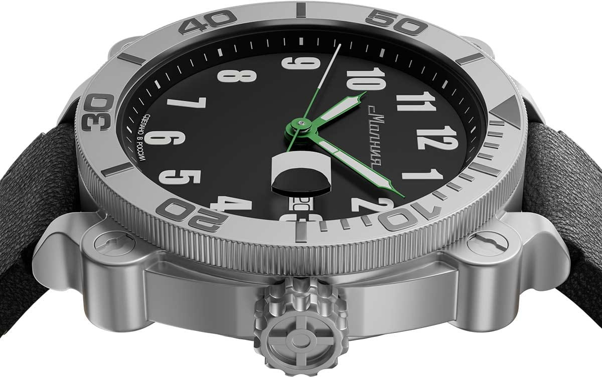 Мужские механические часы с автоподзаводом от бренда «МОЛНИЯ» — это стильный аксессуар, вдохновлённый дизайном приборной панели легендарного танка Т-72. Корпус диаметром 42 мм и толщиной 12 мм выполнен из нержавеющей стали 316L с матовой полировкой. БезельБезельВнешний ободок, закрепляющий стекло. В спортивных часах так называется поворотное кольцо с делениями на циферблате, выполняет роль таймера – замеряет отрезки времени на шкале. Неподвижный безель – элемент декора. Однонаправленно вращающийся безель на дайверских часах позволяет фиксировать моменты погружения и выныривания на поверхность. однонаправленный, вращающийся. Циферблат чёрного цвета оформлен арабскими цифрами и логотипом бренда. Окошко даты расположено в положении 3 часов и оснащено увеличительным стеклом. Стрелки и метки с люминесцентным покрытиемЛюминесцентное покрытиеПозволяет считывать показания времени в темноте. Производители наносят на стрелки, часовые индексы, безель или поверхность циферблата светонакопительный состав, дающий холодное свечение. Super-LumiNova. Циферблат защищён сапфировым стекломСапфировое стеклоПрочный и надёжный материал из кристалла сапфира синтетического происхождения, характеризующийся особой твёрдостью и устойчивостью к царапинам и повреждениям. с антибликовым покрытиемАнтибликовое покрытиеСлой оксида металла в 0,13-0,3 микрон, благодаря которому стекло часов не бликует и не отражает свет. Антибликовое покрытие уменьшает отражение света в 10 раз, обеспечивая отличную читаемость показателей циферблата.. Механизм — японский автоматический калибр Miyota 8215 запас хода до 42 часов. Заводная головка стилизована под гусеничную ленту, задняя крышка с гравировкой танка Т-72. Часы оснащены кожаным ремешком чёрного цвета с классической пряжкой и системой быстрой замены. Водонепроницаемость 100 м позволяет использовать часы для плавания и повседневного ношения. Идеальный выбор для тех, кто ценит инженерное наследие и мощный дизайн.