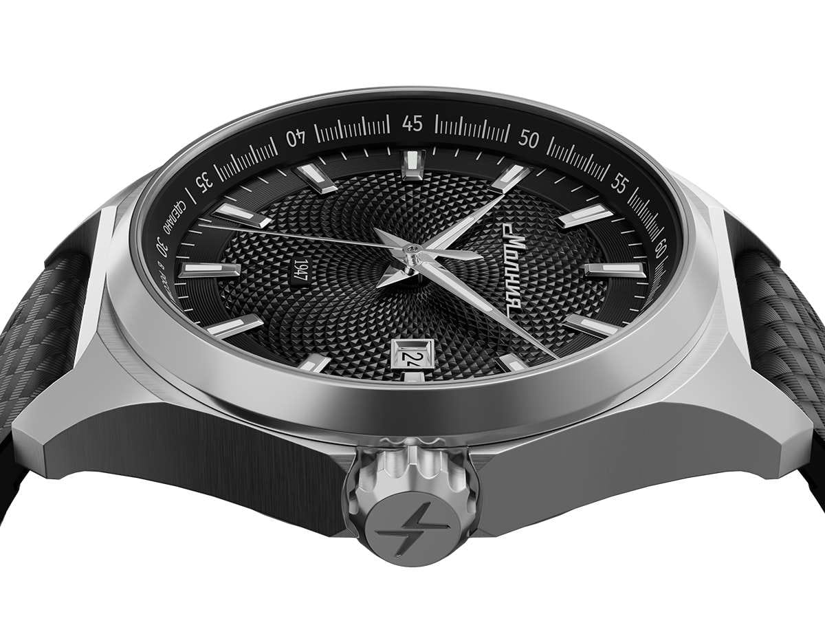 Мужские механические часы с автоподзаводом — это надёжный аксессуар от легендарного бренда «МОЛНИЯ», созданный на Челябинском часовом заводе. Корпус диаметром 42 мм выполнен из нержавеющей стали 316L с зеркальной полировкой. БезельБезельВнешний ободок, закрепляющий стекло. В спортивных часах так называется поворотное кольцо с делениями на циферблате, выполняет роль таймера – замеряет отрезки времени на шкале. Неподвижный безель – элемент декора. Однонаправленно вращающийся безель на дайверских часах позволяет фиксировать моменты погружения и выныривания на поверхность. также выполнен из стали с зеркальной отделкой. Циферблат чёрного цвета оформлен индексами и стрелками. Окошко даты расположено в положении 3 часов. Стрелки и метки с люминесцентным покрытиемЛюминесцентное покрытиеПозволяет считывать показания времени в темноте. Производители наносят на стрелки, часовые индексы, безель или поверхность циферблата светонакопительный состав, дающий холодное свечение. Super-LumiNova, обеспечивающим хорошую читаемость в темноте. Циферблат защищён сапфировым стекломСапфировое стеклоПрочный и надёжный материал из кристалла сапфира синтетического происхождения, характеризующийся особой твёрдостью и устойчивостью к царапинам и повреждениям. с антибликовым покрытиемАнтибликовое покрытиеСлой оксида металла в 0,13-0,3 микрон, благодаря которому стекло часов не бликует и не отражает свет. Антибликовое покрытие уменьшает отражение света в 10 раз, обеспечивая отличную читаемость показателей циферблата.. Механизм — японский автоматический калибр Miyota 8215 с функцией и запасом хода до 42 часов. Прозрачная задняя крышка позволяет наблюдать за работой механизма с кастомным ротором. Часы оснащены кожаным ремешком чёрного цвета с подкладкой из фтористого каучука и классической пряжкой, а также системой быстрой замены. Водонепроницаемость 100 м позволяет использовать часы для плавания и повседневного ношения. Идеальный выбор для тех, кто ценит качество, точность и стиль.