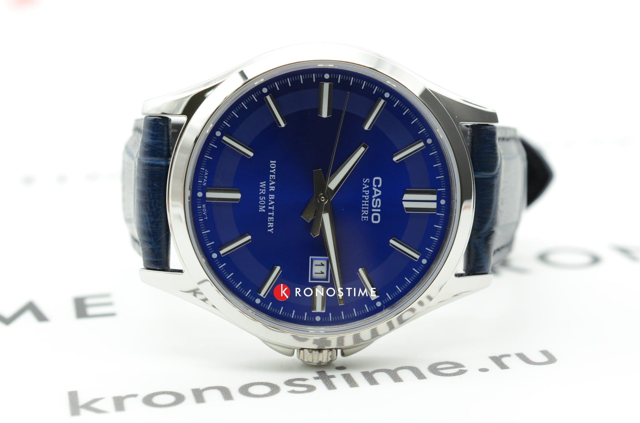 Наручные часы ярко-синего цвета идеальны для ежедневной носки, классический стиль делает их универсальной моделью. Главная особенность заключается в продолжительном сроке службы батарейки, питающей кварцевый механизм - аккумулятор рассчитан на 10 лет эксплуатации. Корпус сделан из хирургической стали 316L, материал устойчив к коррозии. Сапфировое стекло невозможно поцарапать. Люминесцентная подсветкаЛюминесцентное покрытиеПозволяет считывать показания времени в темноте. Производители наносят на стрелки, часовые индексы, безель или поверхность циферблата светонакопительный состав, дающий холодное свечение.. Водонепроницаемость 5 бар. Ремешок из натуральной кожи. Окошко текущего числа. Габариты: 47 x 41,3 x 8,8 мм.